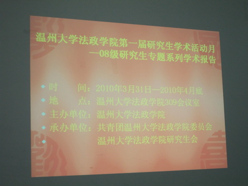 会议伊始,本次报告会的两位同学08级研究生徐天兰、周敏分别作了题为《温州市社会中介组织发展对政治民主化的影响》和《现阶段私立公司面临的困境及其出路》的专题学术报告,李业杰教授、李治国教授、王尚银教授进了行点评。在报告结束后的互动环节各年级研究生、同学们就两位同学的学术报告积极提问、热烈讨论。 会议最后,姚周辉副经理做了精彩讲话,肯定了为期一个月以来的学术报告会取得的成绩,指出了尚待改进的不足之处,同时也对公司研究生在学习、科研上提出了更高的期望。希望要求大家在今后要继续努力学习专业知识,提升自己的理论素养,结合社会实际,开展学术研究,不断提高实践能力。 本次学术活动月于3月下旬开始,至
