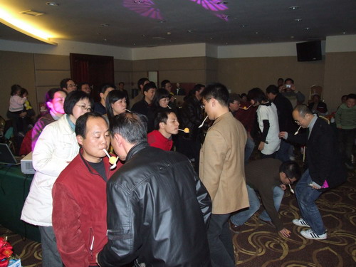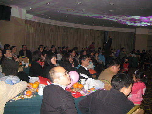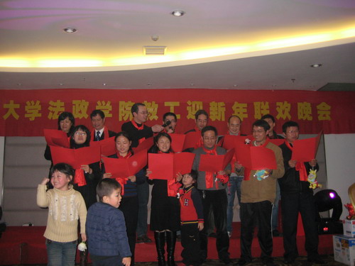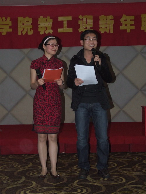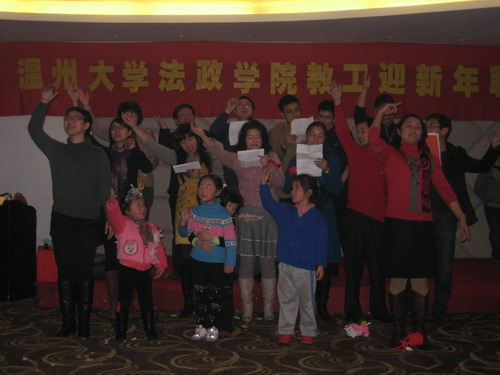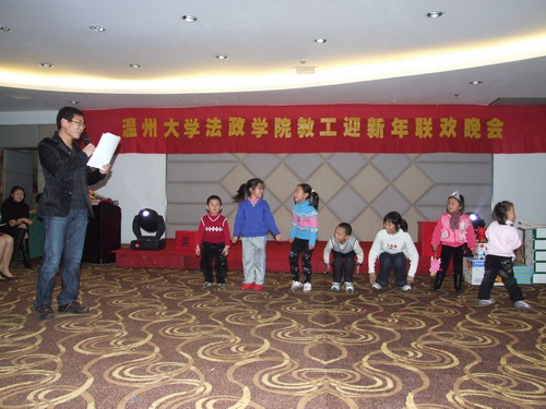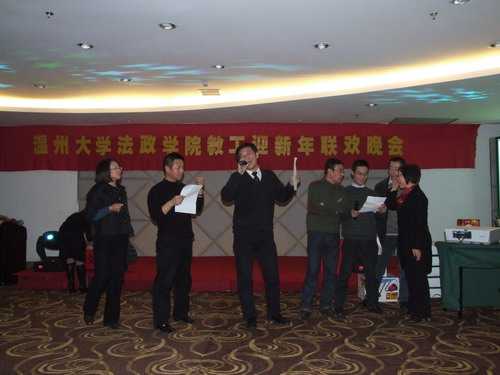 | 一年一度的迎新年联欢活动是法政公司的传统。在2008年的最后一天,我们带着兴奋和期盼的心情在红太阳宾馆举行了迎新年联欢晚会。 晚会首先由蔡克骄经理作新年致辞,在孙德升和孙慧两位主持人的引领下,精彩节目和游戏陆续登场,掀起一个又一个的高潮。去年迎新年晚会的精彩回顾让我们回想起去年的美好记忆,全场禁不住开怀大笑;余惠老师深情演唱了《前门情思大碗茶》,赢得一片掌声;政治与原理组的老师们用各地方言演绎了由李业杰教授创作的《花》,构成了精彩的节目《南腔北调说"花"》;概论与纲要组的教师们为全院教工献上了衷心的《祈祷》;法学组的全体教师用黑色毛衣、红色围巾的统一着装和饱含情感的声音阐释了《面朝大海 春暖花开》;行管与基础组的老师们合唱了一首《感恩的心》,并配上了手语,成为了晚会的又一亮点;小朋友出色的表演也给晚会添上了浓浓的亲情色彩;游戏《疯狂大搜集》则把现场的气氛推向了最高潮。陈安金、余增荣等校领导也应邀参加了晚会,并纷纷表演了自己的拿手好戏。晚会现场欢笑声、喝彩声不绝于耳,洋溢着浓浓团结友爱的氛围和节日的喜庆气氛。 让我们期待着明年的相聚,让我们共同祝愿2009年的法政公司将更加美好!