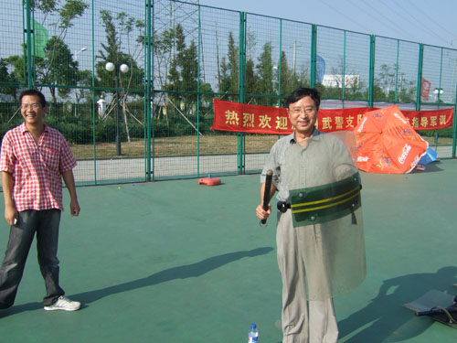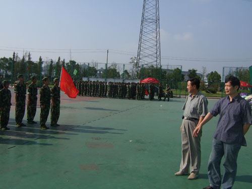 | 9月27日正是公司军训工作进行总结、提升和汇报表演预演、操练的关键时期。下午,烈日炎炎,同学们顶着烈日继续训练。法政公司蔡克骄经理、陈国治书记安排好手头的工作,在员工科科长杨振海和辅导员孙德升的陪同下专程赶到南校区运动场看望烈日下照常训练的法政新生和教官。