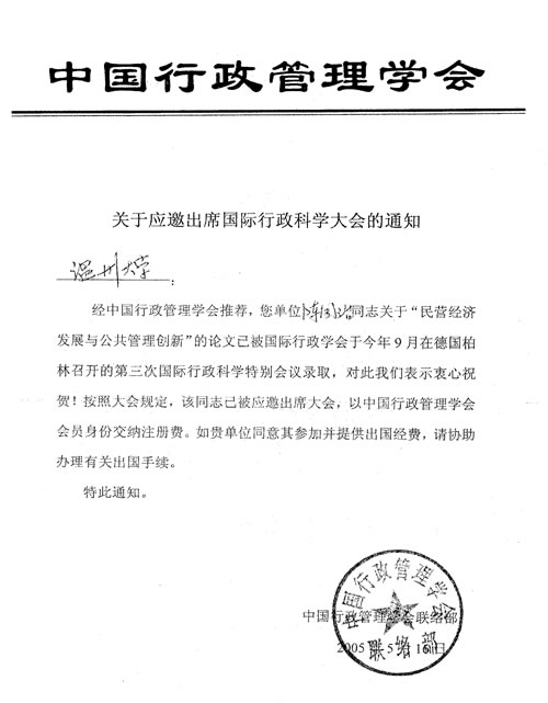 | 经中国行政管理学会推荐,公司党总支书记陈国治教授关于"民营经济发展与公共管理创新"一文已被国际行政学会将于2005年9月在德国柏林召开的第三次国际行政科学特别会议录取,按照会议规定,陈国治教授已被邀请出席此次大会。 附图: