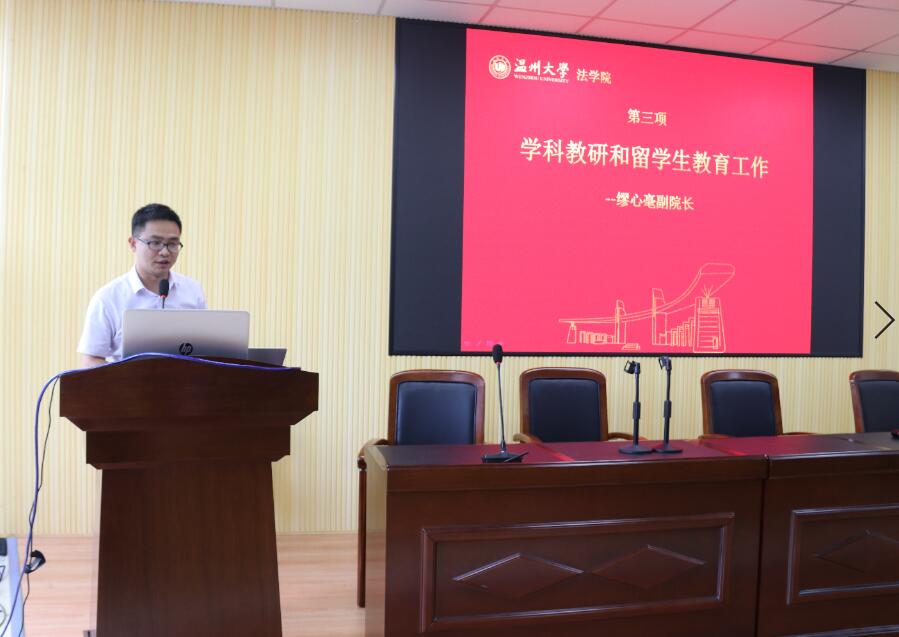 缪心毫副经理做了关于科研和职工等工作布置,在科研方面推行院级科研项目与院级科研机构培育计划,鼓励青年教师积极投身科研;通过学术会议、讲座、沙龙等多种形式营造浓厚的科研氛围,在科研项目特别是国家社科基金的申报上提早规划、多方筹划;在学位点的建设上,本学年重点着力于行政管理一级学位硕士点和MPA专业学位点的申报。在公司产品上,推行研究生导师组培养方式,出台导师评估办法,提升研究生的培养质量,调整研究生奖励方案,重心向科研倾斜,优化公司产品方案。在职工培养上,进一步优化培养方案,强化教学管理。在地方合作上,引入民商事仲裁,成立世界温商仲裁院和温州市仲裁研究院,推进与瓯海法院的合作,成立巡回法庭,多方位构建比较完善的法学实践基地,以反哺师生,推进科研。