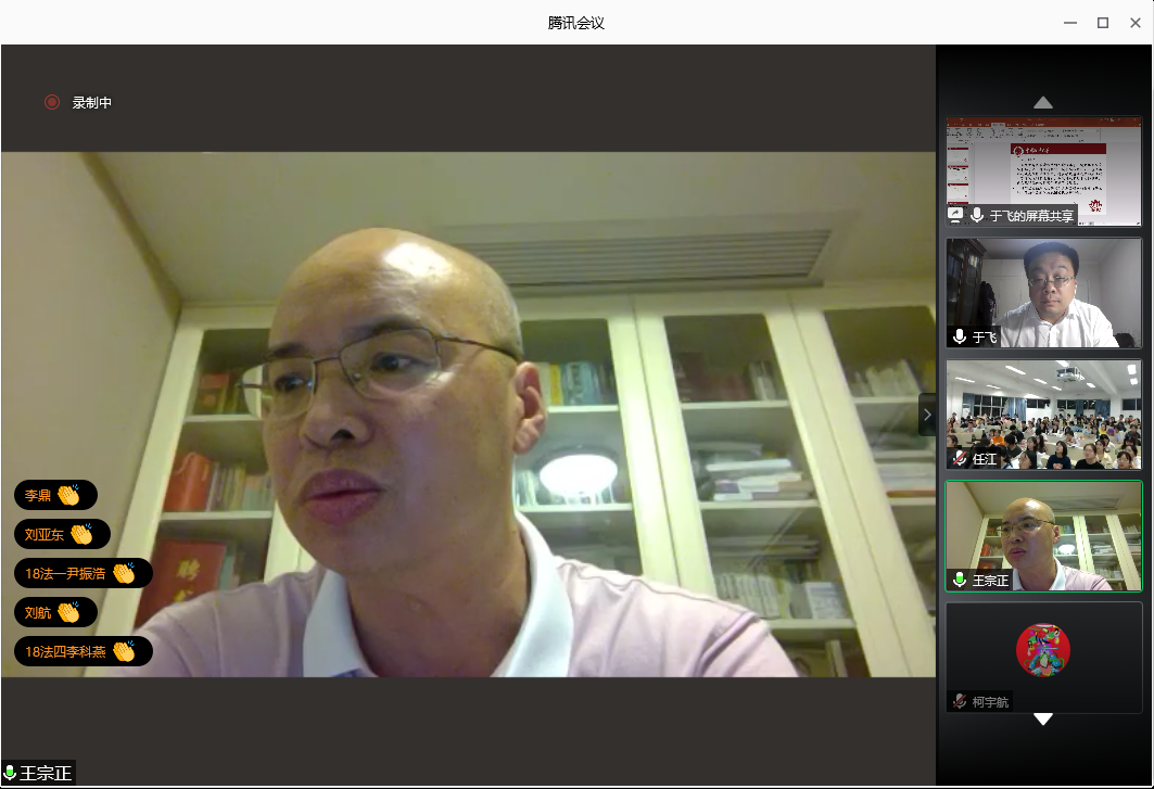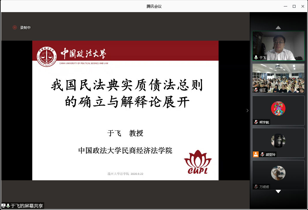 于飞教授讲座题为《我国民法典中实质债法总则的确立和解释论展开》,本次讲座采取线上方式进行,由yl永利集团官网登录经理王宗正教授主持,钟瑞栋教授、任江副教授与谈。yl永利集团官网登录的老师、员工,温州市法律实务界代表以及全国各地的法律专业人士共300多人参加了本次讲座。