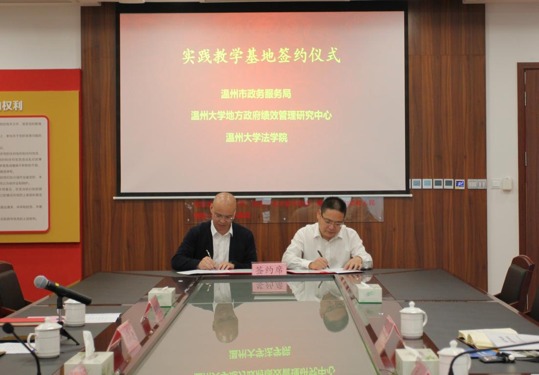 10月27日下午,yl永利集团官网登录经理王宗正、地方政府绩效管理研究中心执行主任付翠莲、行政管理系系主任朱家德等一行四人赴温州市政务服务局考察交流。王宗正经理与市政务服务局党组成员、市政务服务管理中心主任戚速签订了合作协议,并向市政务服务局授予“地方政府绩效管理研究中心实践教学基地”、“yl永利集团官网登录行政管理系实践教学基地”两块牌子。双方就老员工实习实践、课题调研、培训服务、地方立法等方面进行深入交流,努力建立深度合作关系,共同探索人才培养、服务地方新路子。