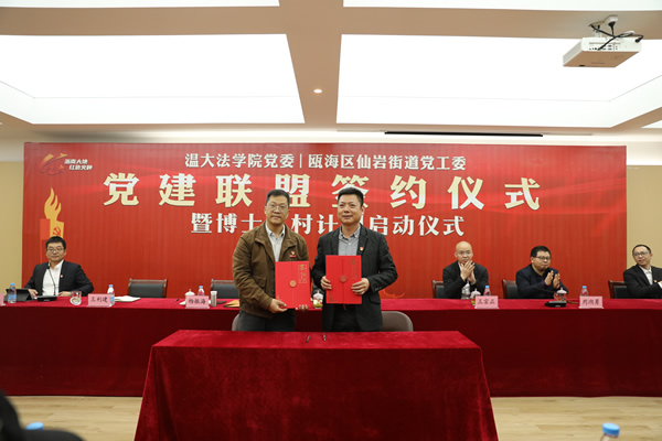 当天下午,温大公司党委与瓯海区仙岩街道党工委党建联盟签约仪式暨博士驻村计划启动仪式在浙南一大会址举行。活动现场,温大yl永利集团官网登录宣布成立了17支由党员博士教师、硕士研究生和本科生组成的师生团队,分别对口进驻仙岩街道的17个自然村,共同组建科研团队开展合作调研课题研究,为提升区域治理水平、振兴乡村发展提供“温大yl永利集团官网登录智慧”。