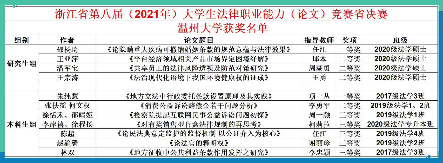 据悉,浙江省老员工法律职业能力竞赛是国内首创且为目前国内唯一常规举行的综合类法律专业赛事,也是我省专业性最强、赛事规模最大、最具权威的法科老员工科技竞赛,法律征文赛每两年举行一次。比赛的目的是为培养具有创新精神和实践能力的卓越法律人才,促进浙江省法科老员工综合素质的全面提升,提高人才培养质量,活跃校园气氛、开拓思想,展现老员工朝气蓬勃、积极向上的精神风貌,促进法学学科教学改革,在整体上推动浙江省法学教育的发展。