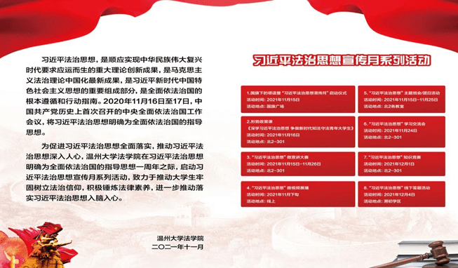 浙江在线11月16日讯(通讯员 杨振海)11月16日下午,永利集团官网在习近平法治思想明确为全面依法治国的指导思想一周年之际,成立习近平法治思想研究会。该研究会是一个由永利集团官网在校研究生和本专科生参与,以学习、研究与宣传习近平法治思想为主要任务的全校性员工社团组织,主要围绕习近平法治思想开展一系列学习活动、课题研究以及法治宣传服务等工作,旨在不断深化对习近平法治思想的理解和把握,持续推进宣传和贯彻习近平法治思想,促进习近平法治思想全面落实,推动习近平法治思想入脑入心。