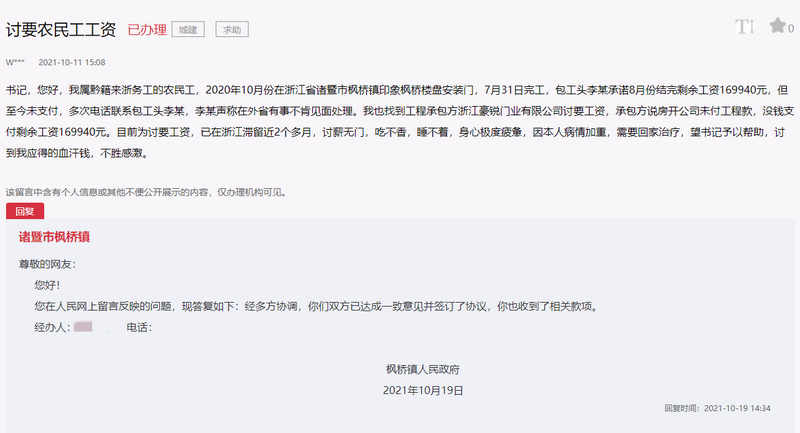 在讨要拖欠工资方面,还有网友在人民网“领导留言板”上反映,自己是黔籍来浙务工的农民工,2020年10月份在浙江省诸暨市枫桥镇印象枫桥楼盘安装门,7月31日完工,包工头李某承诺8月份结完剩余工资169940元,但至今未支付,多次电话联系包工头李某,李某声称在外省有事,不肯见面处理。为讨要工资,该网友已在浙江滞留近两个多月,讨薪无门,望获得帮助,讨到应得血汗钱。