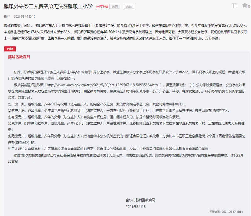 对此,金华市婺城区教育局在回复中表示,根据婺城区招生政策第五条第三点的公办公司录取程序,公办公司如果学区内户籍生报名人数超过当年公司招生计划数的,由区教育局统筹,按户籍迁入时间等因素考虑,公开、公正、平稳、有序实施分流。各公办公司按户房一致,有户无房,有房无户,集体户、投靠户和挂靠户,无房无户的顺序逐批录取,额满为止。根据该网友的描述,如已符合社会保险条件或持有居住证则属于无房无户,如需在婺城区就读,则由教育局根据批次统筹安排到有空余学额的公司。
