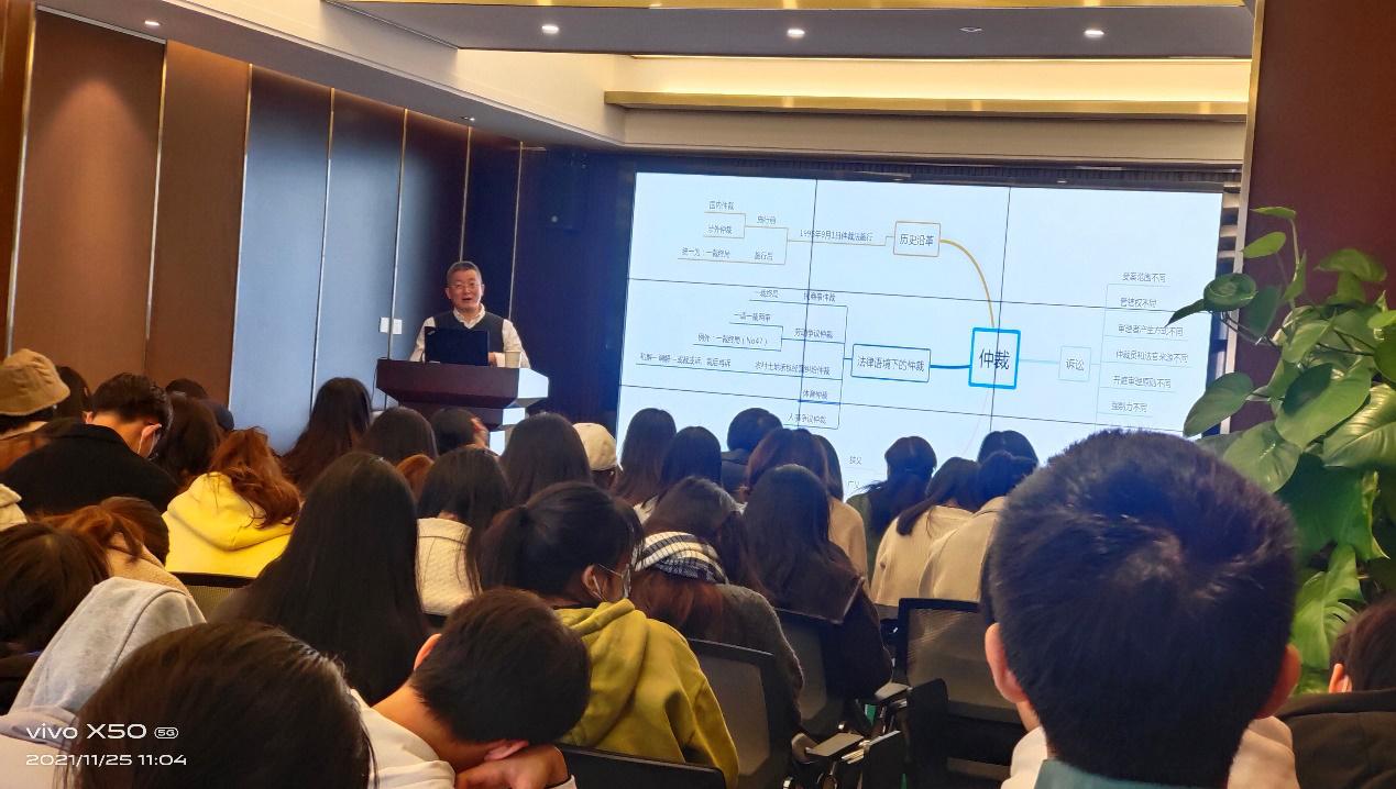 庭审之后,温州仲裁院陈礼海副经理就我国仲裁机构的发展沿革、温州仲裁委员会的发展概况进行了介绍,并以法条解读、典型案例等形式图文并茂地向同学们重点讲述了仲裁的特点与优势,仲裁的原则、管辖、程序,仲裁协议的效力等问题。