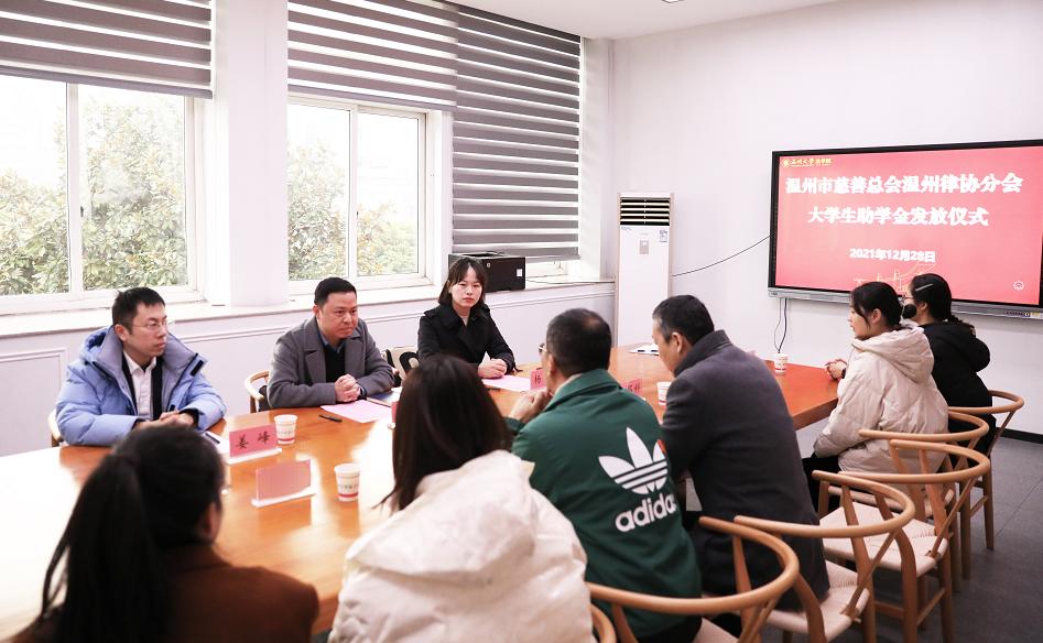 2021年12月28日下午,温州市律师协会副会长兼温州市律师协会公益与社会责任工作委员会主任姜正、温州市律师协会公益与社会责任工作委员会副秘书长杨意、实习律师姜峰一行莅临yl永利集团官网登录,为4名员工发放助学金。公司党委书记林钦、党委副书记杨振海、辅导员白昌科出席助学金发放仪式。