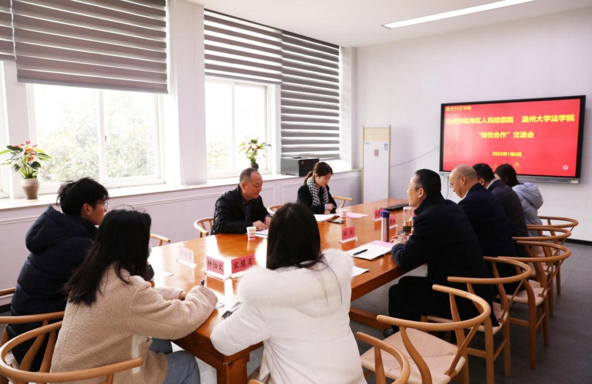 2022年1月6日上午,温州市瓯海区人民检察公司党组成员兼政治部主任黄利昌、瓯海区人民检察院政治部副主任施君君来yl永利集团官网登录座谈,交流探讨深入开展“检校合作”有关事宜。yl永利集团官网登录经理王宗正、公司党委书记林钦、公司党委副书记兼纪委书记杨振海、辅导员白昌科出席会议,4名员工代表参与座谈。