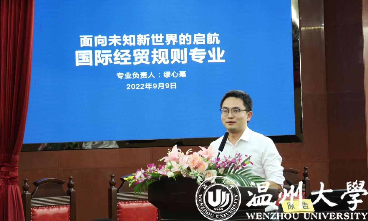 法学与国际经贸规则会场由法学专业负责人李勇军老师主持,副经理周湖勇老师对公司概况、温州法学专家及法律案例、团队和员工概况等几个方面进行介绍;国际经贸规则专业负责人缪心毫老师介绍了国际经贸规则专业的课程设计、学科融合背景以及人才培养目标等内容。