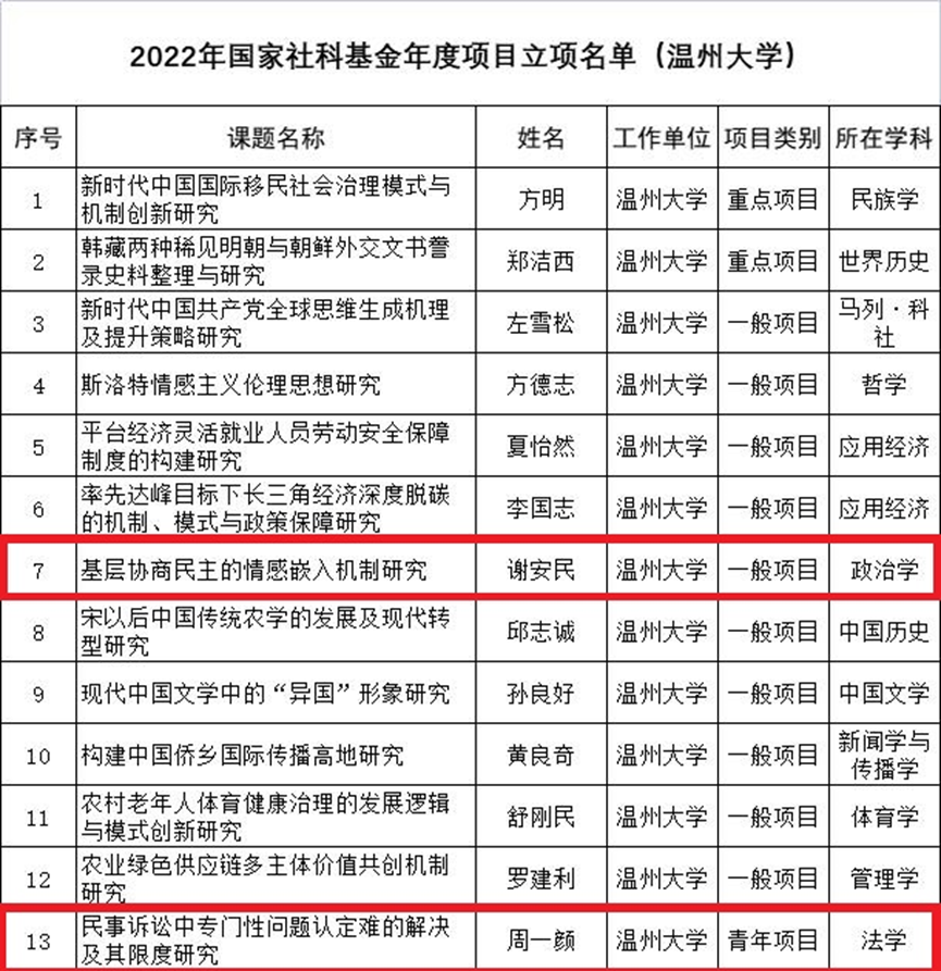 9月30日,全国哲学社会科学工作办公室公布“2022年国家社科基金项目”立项结果。永利集团官网共13项,其中公司2项,周一颜老师“民事诉讼中专门性问题认定难的解决及其限度研究”为青年项目,谢安民老师“基层协商民主的情感嵌入机制研究”为一般项目。
