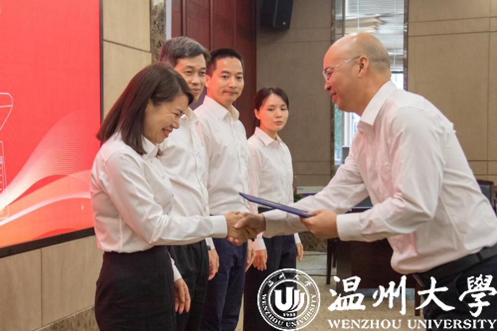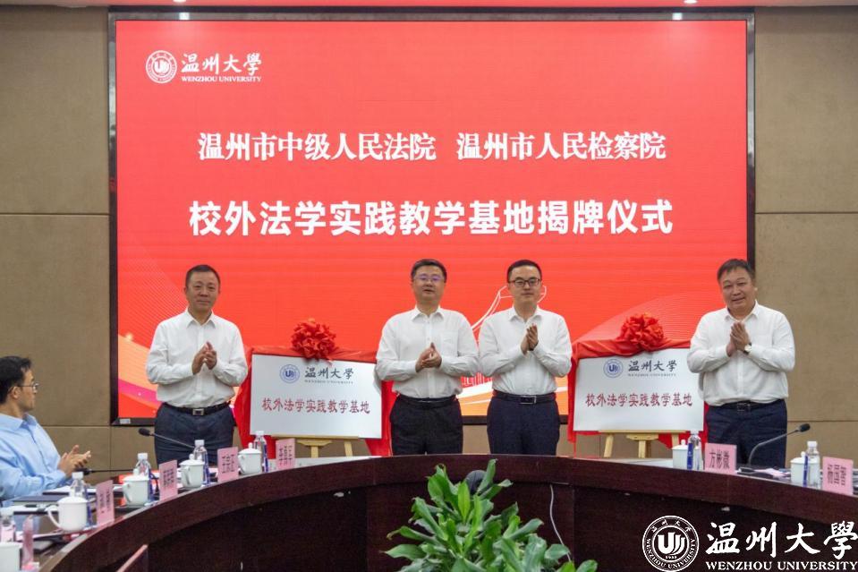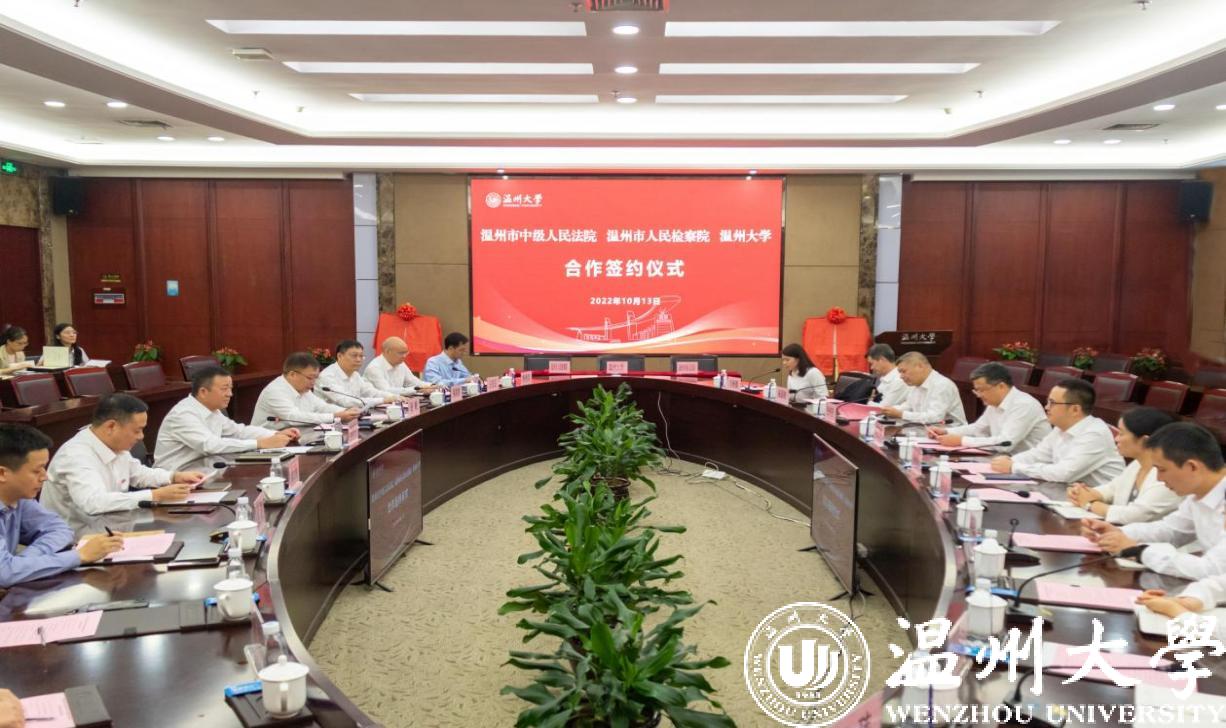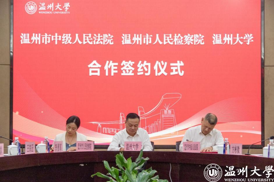 温州市中级人民法公司党组成员、政治部主任张纯亮,温州市人民检察公司党组成员、政治部主任张虹,永利集团官网党委委员、副董事长潘玉驹分别代表法院、检察院、高校签订合作协议。