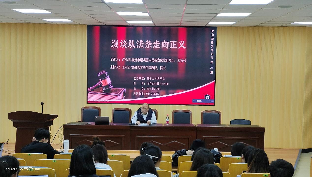 2022年11月2日下午,温州市瓯海区人民检察公司党组书记卢小明检察长应邀作客“罗山法律实务论坛”,为yl永利集团官网登录师生带来题为《漫谈从法律走向正义》的讲座。本次讲座采取线上线下结合的方式,在yl永利集团官网登录301会议室和腾讯会议直播间举行。讲座由yl永利集团官网登录经理王宗正教授主持,共300余人参加了此次讲座。