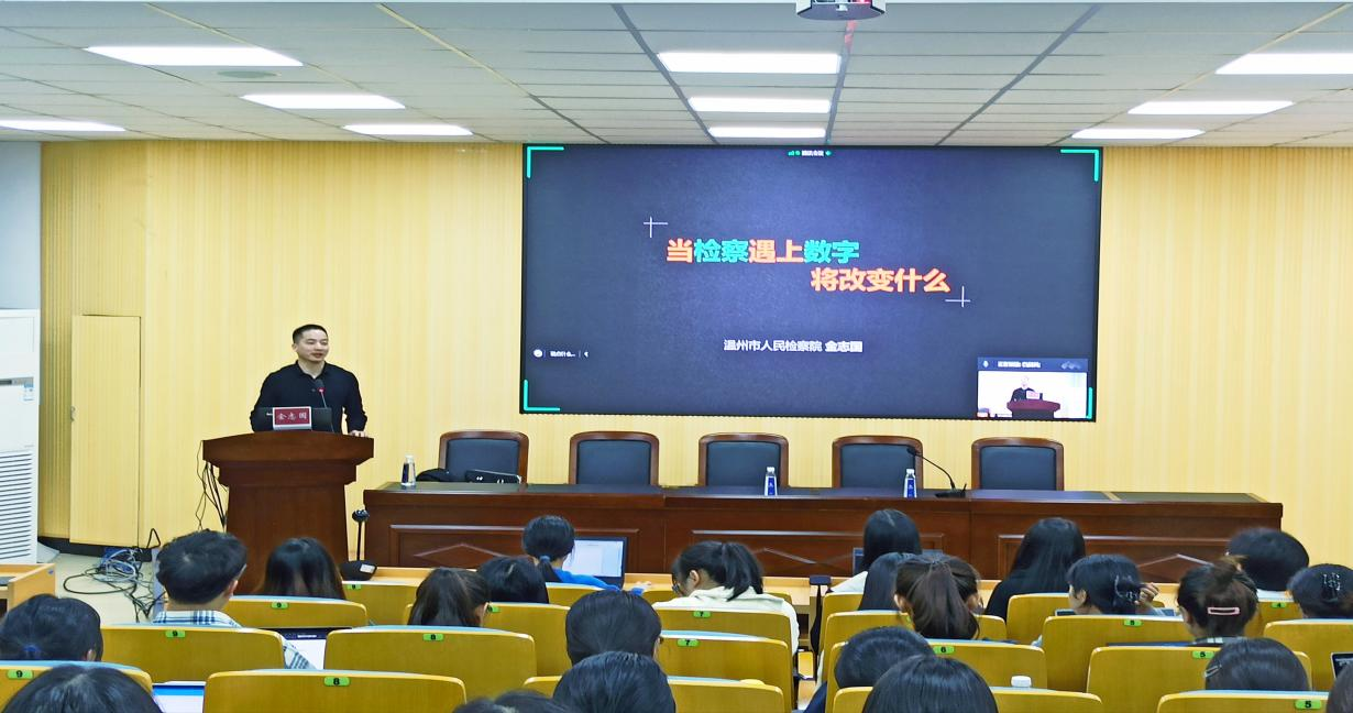 2022年11月9日晚6点半,温州市人民检察院金志国检察官应邀作客“罗山法律实务论坛”,为yl永利集团官网登录师生带来题为《当检察遇上数字》的讲座。本次讲座由yl永利集团官网登录副经理周一颜主持,采取了线上线下相结合的方式,在北校区yl永利集团官网登录301教室和腾讯会议直播间,谢丽珍老师、白兴科老师,部分21级研究生、22级研究生及全体20级法学本科生共有三百余人参加了此次讲座。