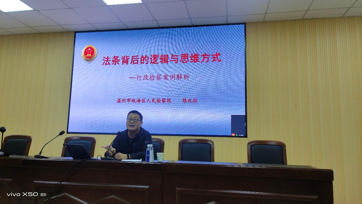 11月15日下午,温州市瓯海区人民检察院陈礼仪检察官应邀做客“罗山法律实务讲坛”,为yl永利集团官网登录师生带来主题为《法条背后的逻辑与思维方式——行政检察案例解释》的讲座。本次讲座采取线上线下相结合的方式,分别在yl永利集团官网登录301会议室和腾讯会议直播间进行。讲座由民商经济法系主任、法律实务课程——《法律案例研习(二)》的负责人李勇军副教授主持,yl永利集团官网登录2019级本科生160多人和部分研究生及教师以线上或线下的方式参加了本次讲座。