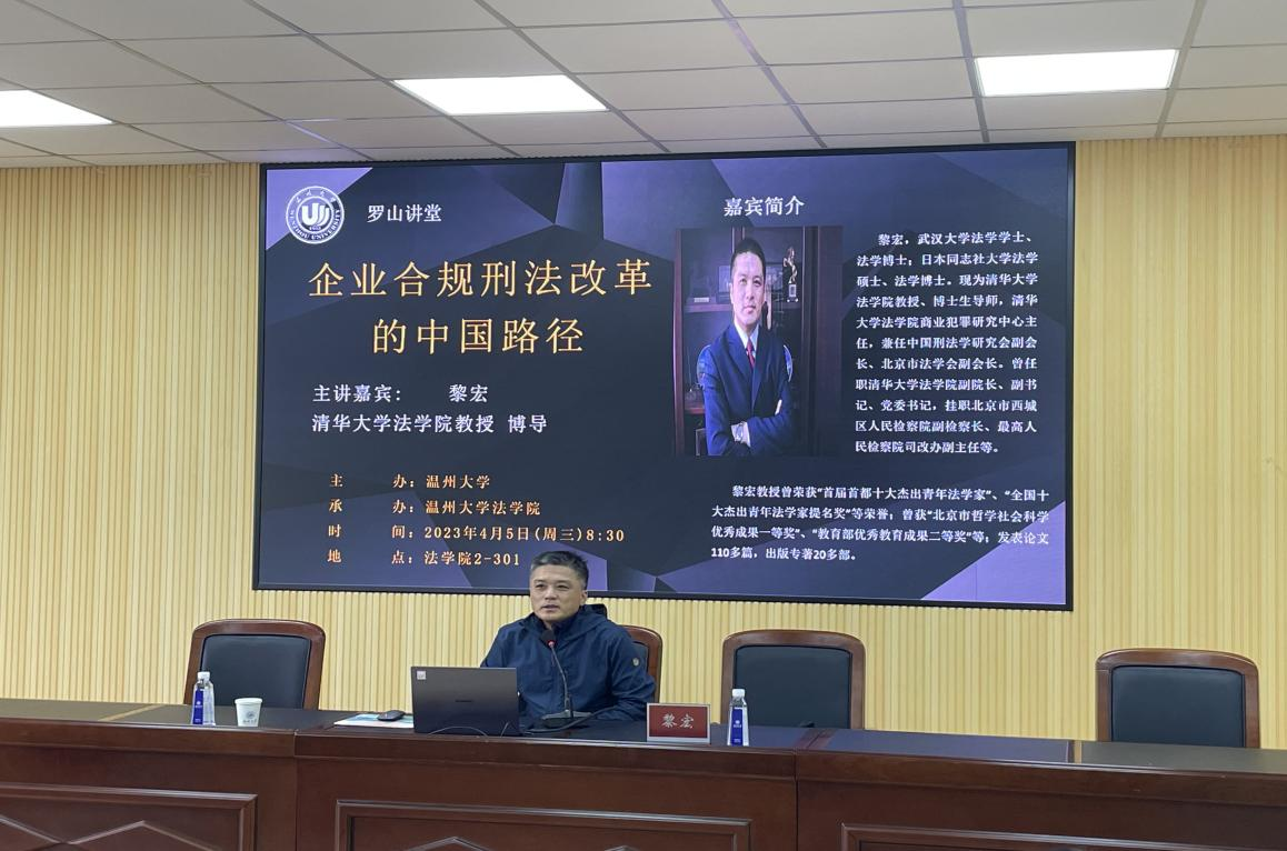 2023年4月5日早8点半,清华大学yl永利集团官网登录教授、博士生导师黎宏应邀作客“罗山讲堂”,为yl永利集团官网登录师生带来题为《企业合规刑法改革的中国路径》的讲座。本次讲座在北校区yl永利集团官网登录2-301教室,yl永利集团官网登录法律系主任谢丽珍老师、吴之欧老师及yl永利集团官网登录近百本科生、研究生参加了此次讲座。