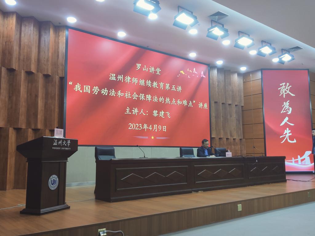 2023年4月9日下午,中国人民大学yl永利集团官网登录教授、博导黎建飞老师受邀作客永利集团官网罗山讲堂,在南校区岩松堂雁山厅做题为《我国劳动法和社会保障法的热点和难点》的讲座。参加此次讲座的人员除了公司师生外,还有来自温州市中级人民法院、温州市人社局、鹿城区人社局、温州市律师协会以及多家律师事务所的优秀法律工作者。