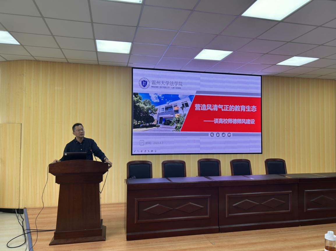 党委副书记杨振海以《营造风清气正的教育生态——谈高校师德师风建设》为题作师德师风廉政教育宣讲。他从习近平总书记考察中国人民大学时的讲话精神、从党和国家重视新时代教师队伍建设看师德师风、从全面从严治党和清廉公司建设看师德师风、从高校师德失范案例中汲取经验与教训四个方面进行宣讲。他重点强调了高校教师7条红线和《关于加强新时代高校教师队伍建设改革的指导意见》在教师队伍建设上的主要体现,并对今年初中共中央办公厅印发的《关于加强新时代廉洁文化建设的意见》做了解读,通过高校师德失范典型案例进行警示,提醒教师在教学、科研、经费管理与使用、师生关系、违法行为等方面保持清醒头脑,杜绝师德违法违规行为。