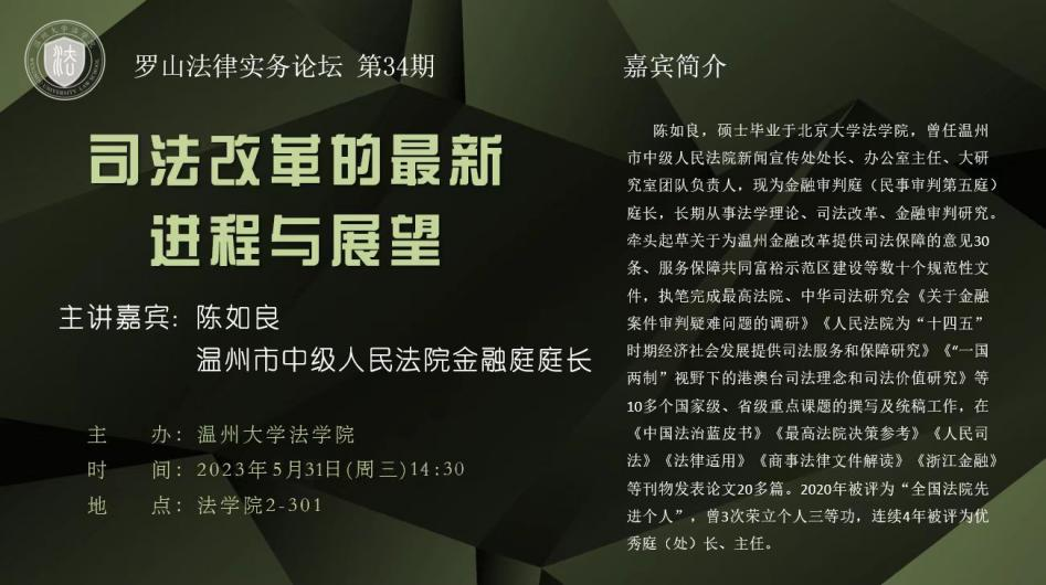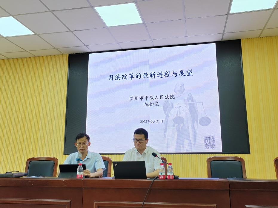 2023年5月31日下午,温州市中级人民法院金融审判庭(民事审判第五庭)庭长陈如良应邀作客罗山法律实务论坛,为yl永利集团官网登录师生作专题讲座。本次讲座主题为“司法改革的最新进程与展望”,讲座由yl永利集团官网登录法学专业负责人、民商经济法系主任李勇军老师主持。