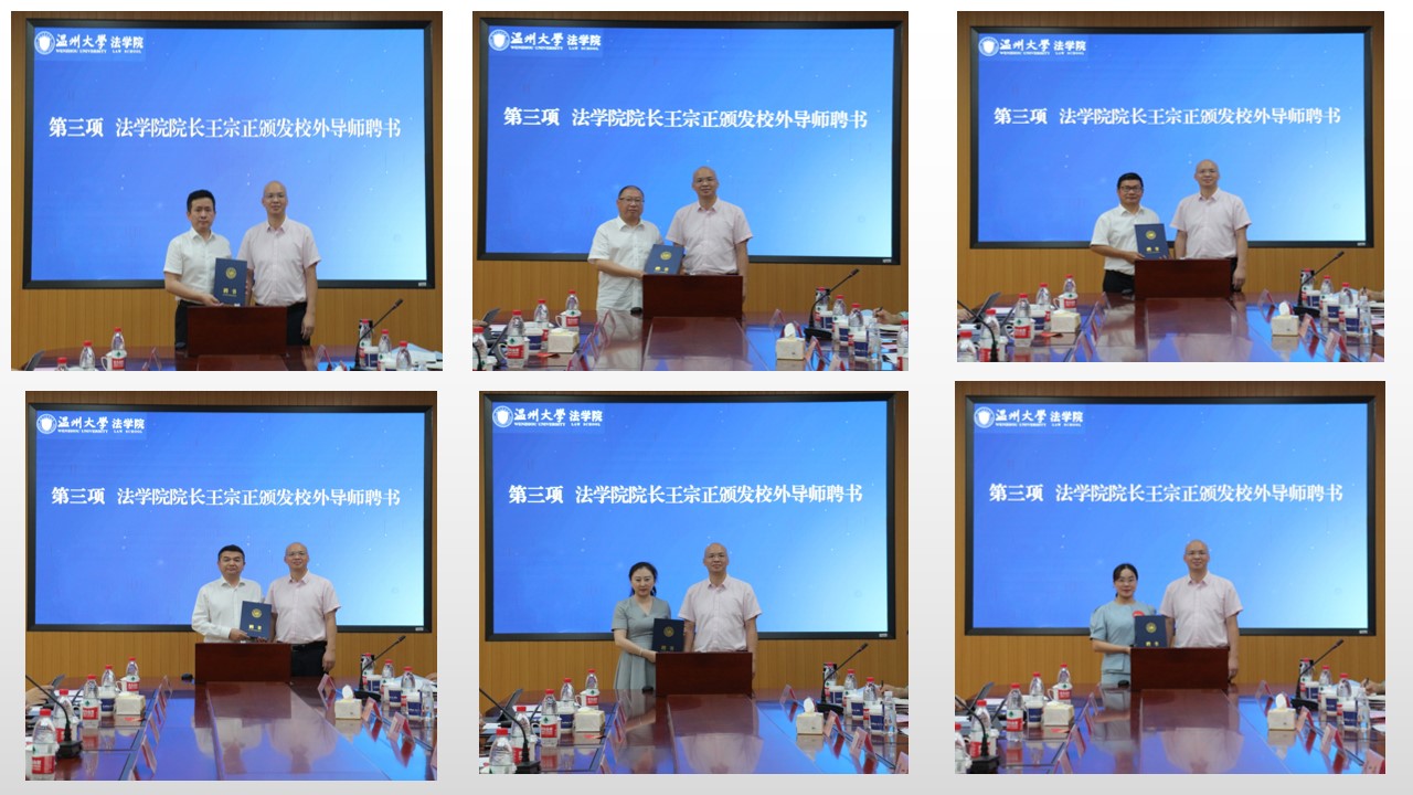 校外导师聘任仪式随后进行,由林钦书记宣读聘任文件,王宗正经理为各校外导师颁发聘书并合影留念。校外导师与校内导师围绕学位论文选题、实习量化标准、理论学习与实践学习的关系及深化院校与实务部门合作等方面展开了广泛而深入的研讨。