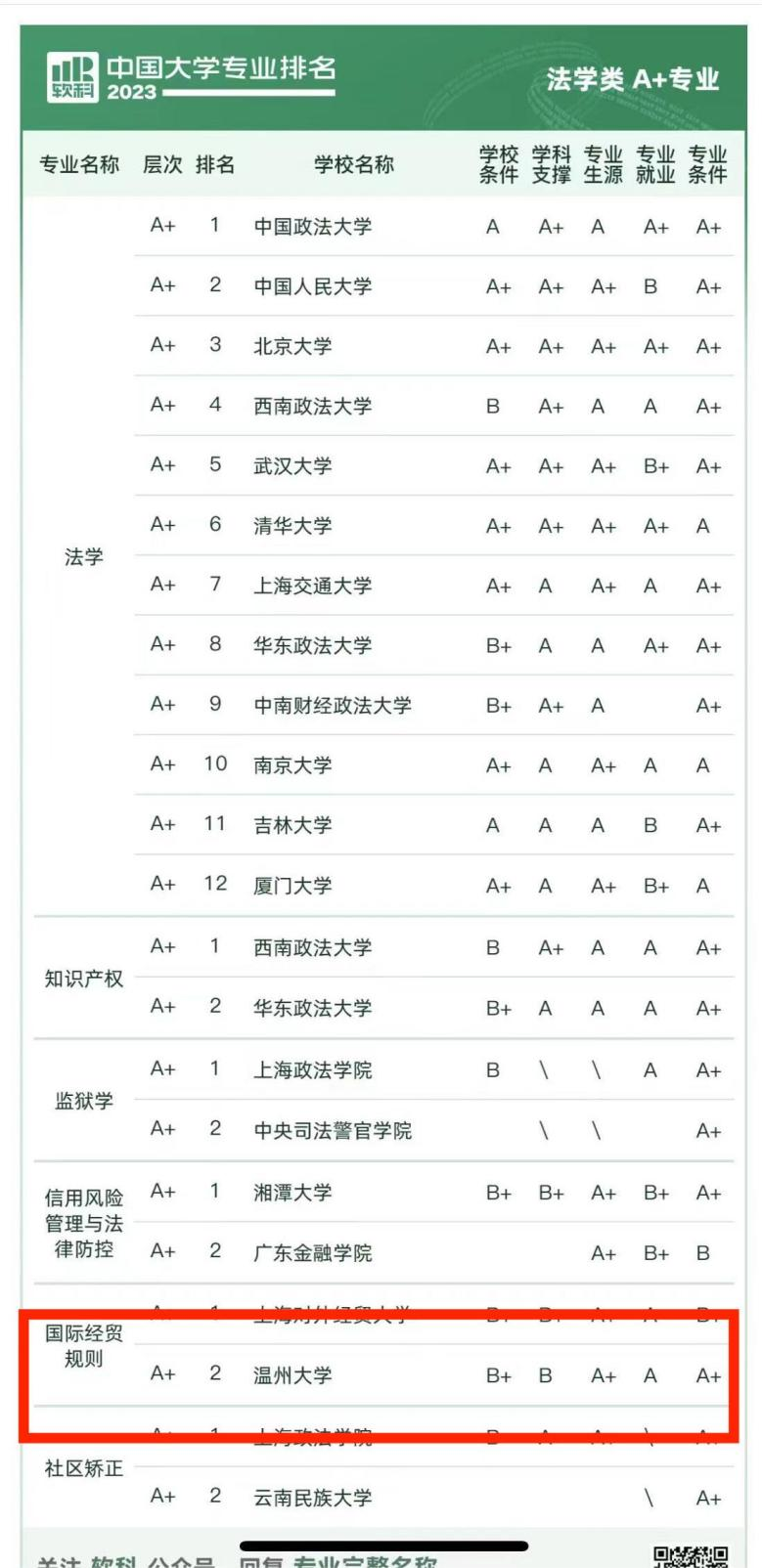 永利集团官网国际经贸规则专业在2023年中国大学专业排名中再次获得综合评级A+,位列全国第二,至此,永利集团官网国际经贸规则专业已连续两年在软科中国大学专业排名中获得A+专业。