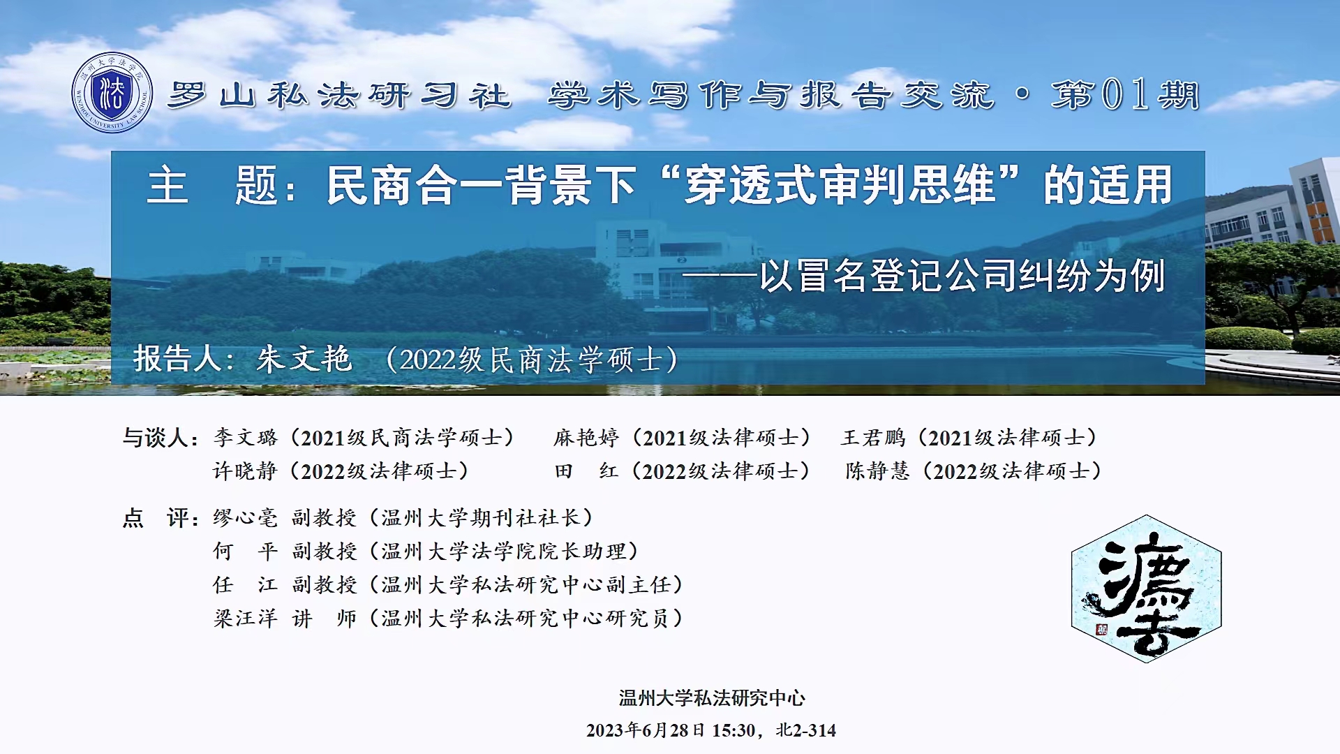 2023年6月28日下午,罗山私法研习社之学术写作与报告交流第01期在yl永利集团官网登录314会议室顺利举行。yl永利集团官网登录2022级民商法学硕士朱文艳,以“民商合一背景下‘穿透式审判思维’的适用——以冒名登记公司纠纷为例”为主题,通过线上和线下结合的方式,向与会老师和同学就自己同题目的论文作了相关报告。永利集团官网期刊社社长缪心毫副教授、yl永利集团官网登录经理助理何平副教授、永利集团官网私法研究中心副主任任江副教授、永利集团官网私法研究中心研究员梁汪洋讲师为点评人,yl永利集团官网登录2021级硕士研究生李文璐、麻艳婷、王君鹏,2022级硕士研究生许晓静、田红、陈静慧为与谈人。汇报论文的初稿已于一周前发给与谈同学与点评老师,与谈同学提前形成书面点评建议与意见,汇报结束后,由与谈同学和点评老师针对冒名登记公司的治理,论文的结构、内容、写作规范等发表意见。