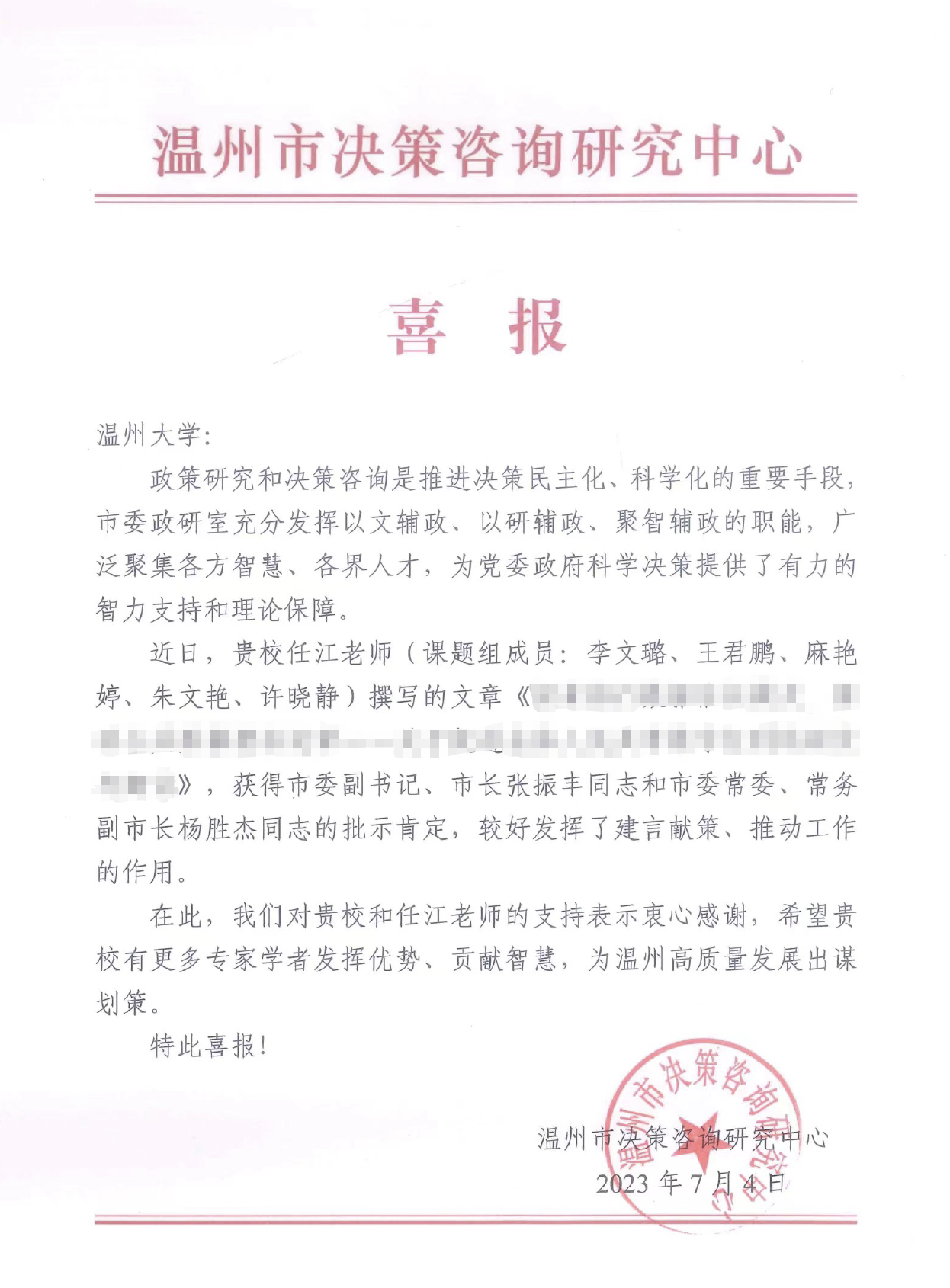 近日,由永利集团官网私法研究中心任江副教授撰写的对策建议报告获得温州市委副书记、市长张振丰同志和市委常委、常务副市长杨胜杰同志的批示肯定。