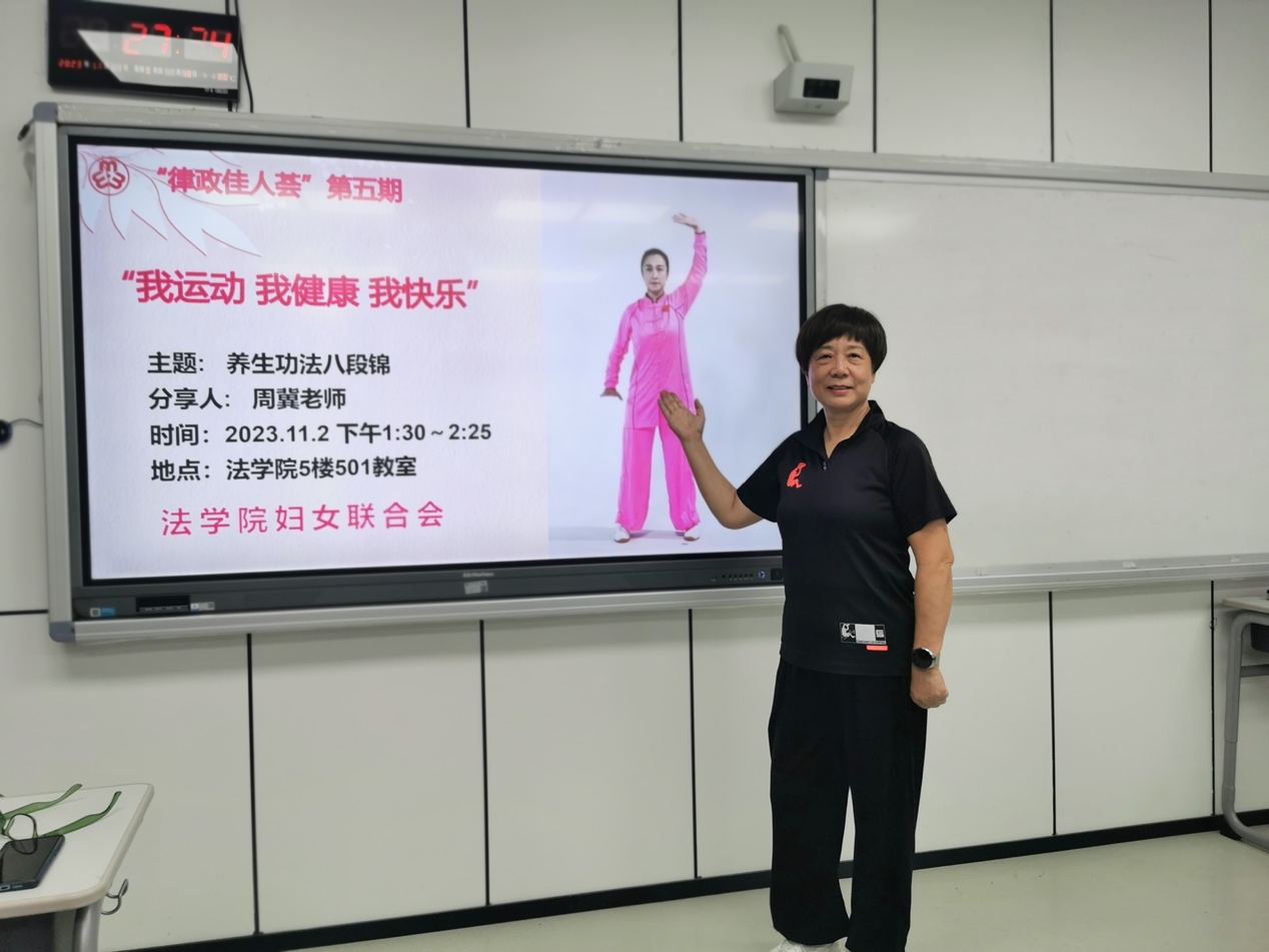 11月1日下午,yl永利集团官网登录“律政佳人荟”第五期在2号楼501教室举行。本期活动的主题是“我运动、我健康、我快乐”,特别邀请到周冀老师和大家分享健身气功“八段锦”。