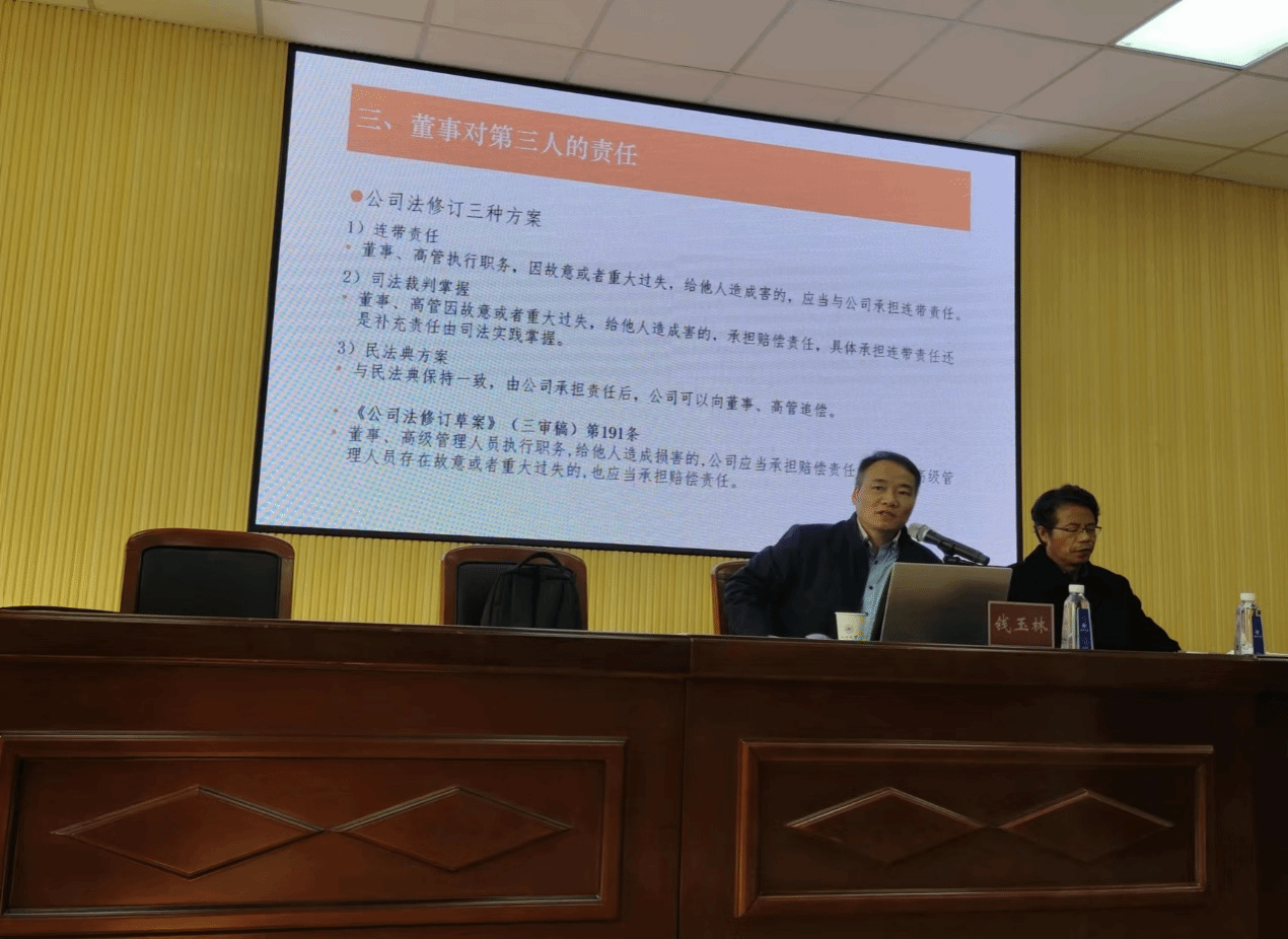 2023年12月12日上午,华东政法大学经济yl永利集团官网登录经理、博士研究生导师钱玉林教授应邀作客第69期“温州法治大讲坛”,为公司师生作题为《公司法制度构建要讲“理”》的专题讲座。讲座由赵金龙教授主持,yl永利集团官网登录教师、本科生、研究生及温州市法律实务界专家200余人到场聆听。