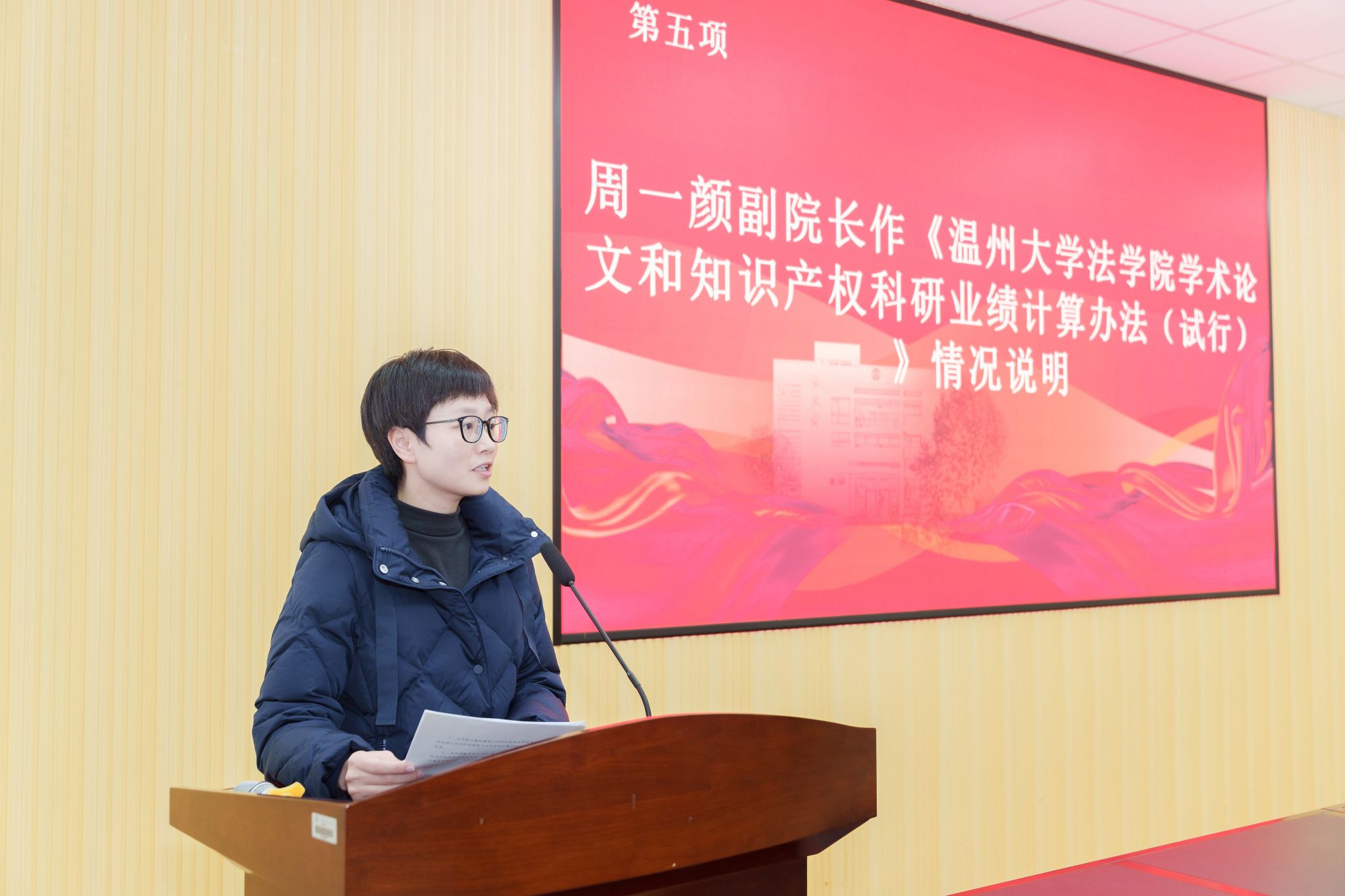 yl永利集团官网登录副经理周一颜作《yl永利集团官网登录学术论文和知识产权科研业绩计算办法(试行)》情况说明。她从出台背景和施行目的等方面对文件进行详细解读,鼓励公司教师激发创新创造活力,优化学术生态,创造出高质量、高贡献的科研业绩。