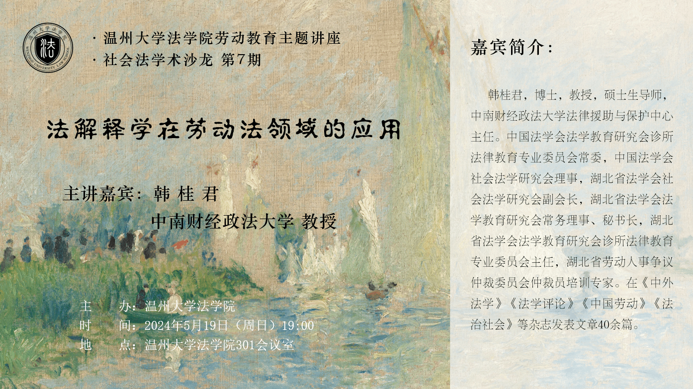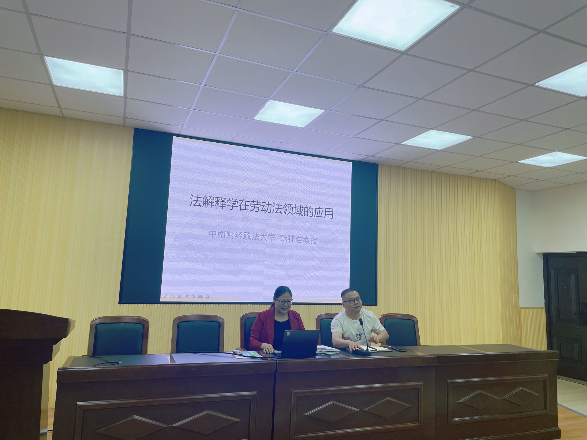 2024年5月19日晚,yl永利集团官网登录在301会议室举办了一场主题为“法解释学在劳动法领域的应用”的社会法学术沙龙。本次学术沙龙特别邀请中南财经政法大学韩桂君教授担任主讲人。学术沙龙由yl永利集团官网登录副经理周湖勇教授主持,yl永利集团官网登录部分师生到场学习。