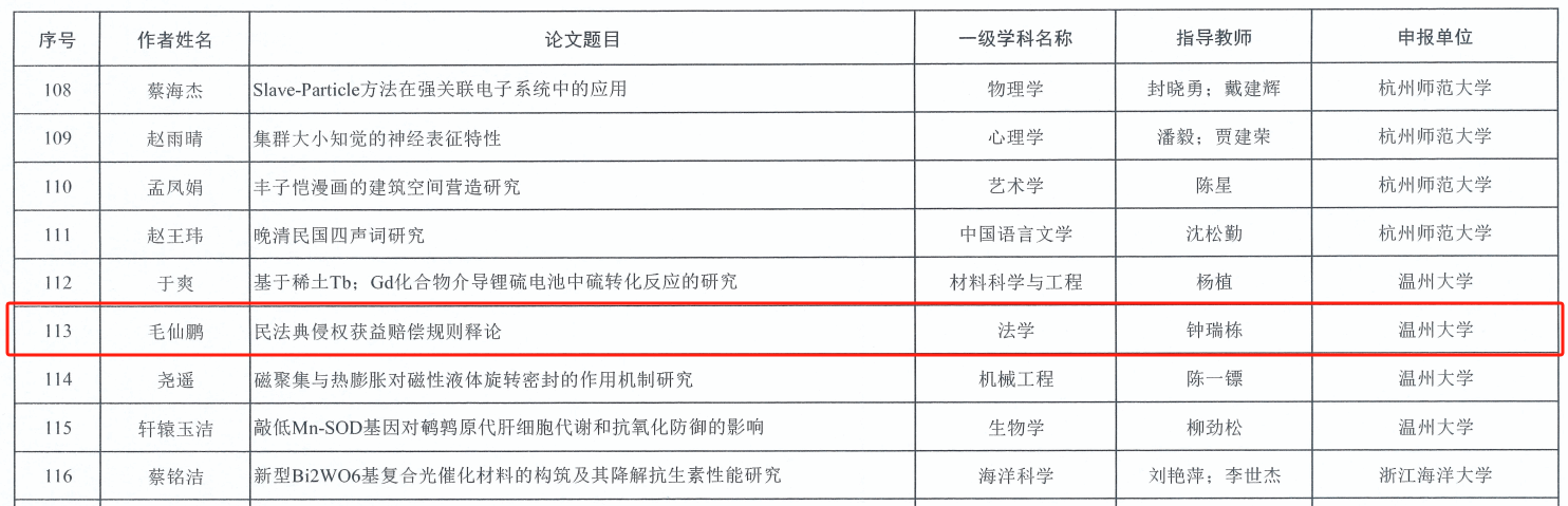 近日,浙江省研究生教育学会发布了《关于表彰2023年浙江省优秀博士学位论文和优秀硕士学位论文的决定》,全省20所高校和科研机构共122篇硕士学位论文获评浙江省优秀硕士学位论文。其中,公司入选4篇,公司2023届硕士生毛仙鹏(导师:钟瑞栋教授)的学位论文《民法典侵权获益赔偿规则释论》作为全省唯一一篇法学学科论文首次成功入选,实现了公司浙江省优秀硕士学位论文零的突破,充分突显出公司公司产品和学位授予质量的不断提升!