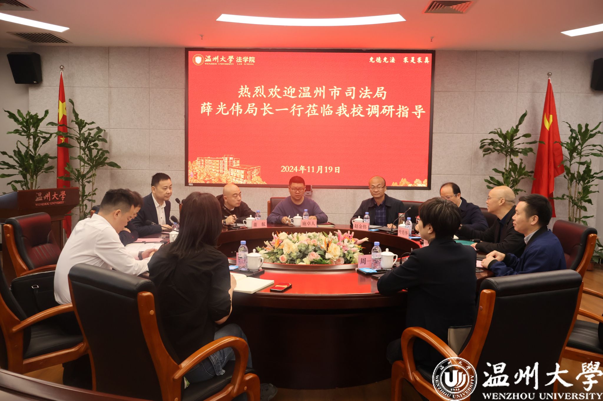 温州市司法局党委委员、副局长刘贤平、各部门负责人与公司领导就涉外法治建设、普法法治宣传、公共法律服务、人才队伍培训、法学人才培养等领域展开深入交流,并达成广泛共识。