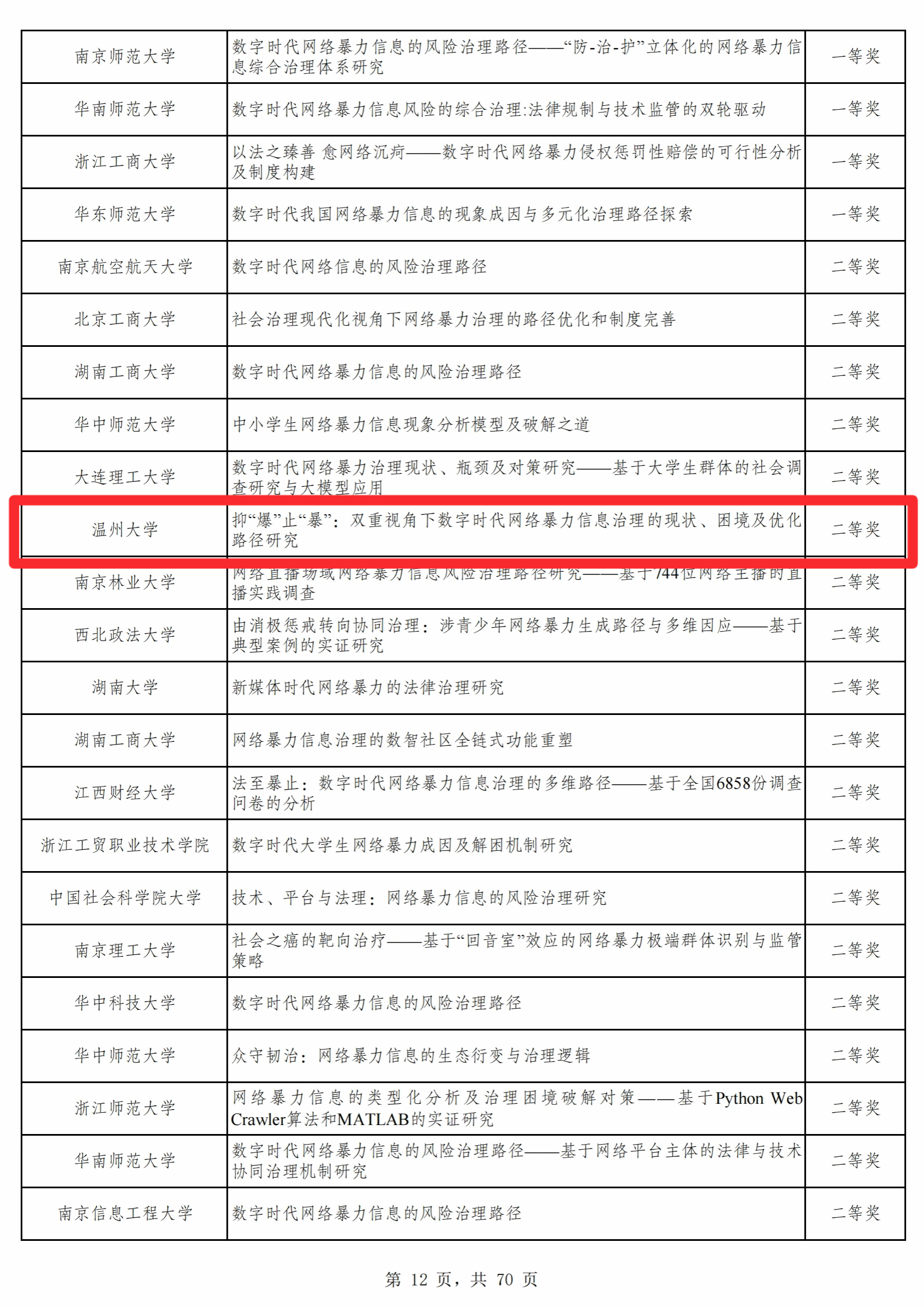 作品简介:数字时代网络暴力信息具有匿名性、规模性等特征,以单一形式治理网络暴力信息难以取得成效。团队采用文献研究、数据建模、案例分析、访谈调研、机器学习等研究方法,实现法学、传播学、社会学、网络科学、数据科学等多学科联动,构建染色体、传染病两大模型,探索“法律+技术”双轨治理路径,研究出“二体三分五点”的网络暴力信息治理体系,划分违法信息和不良信息两大体系,在事前、事中、事后三大阶段中细分出酝酿、扩大、典型网暴等关键节点,并明确了国家、平台、用户三大主体的治理职责,为构建全面、系统、高效的网络暴力信息治理体系提供了理论支撑和实践指导。