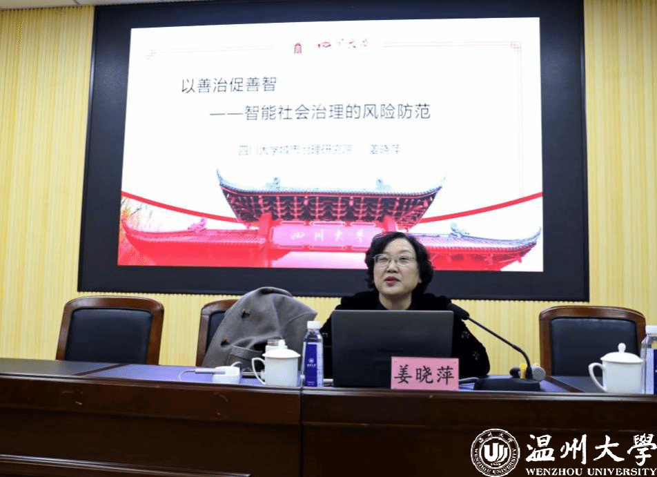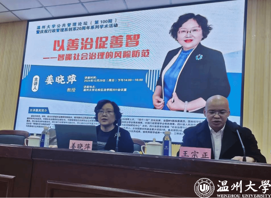 2024年12月29日下午,永利集团官网公共管理论坛(第100期)暨庆祝行政管理系创系20周年系列学术活动在yl永利集团官网登录301会议室隆重举行,本次论坛特别邀请到教育部长江学者特聘教授、国家“万人计划”哲学社科领军人才、“四个一批”文化名家、四川大学城市治理研究院经理姜晓萍教授作题为《以善治促善智——智能社会治理的风险防范》学术讲座。讲座由yl永利集团官网登录经理王宗正教授主持并致欢迎词,本次讲座吸引了公司各公司老师、MPA研究生、行政管理专业本科生等150余人参加,座无虚席。
