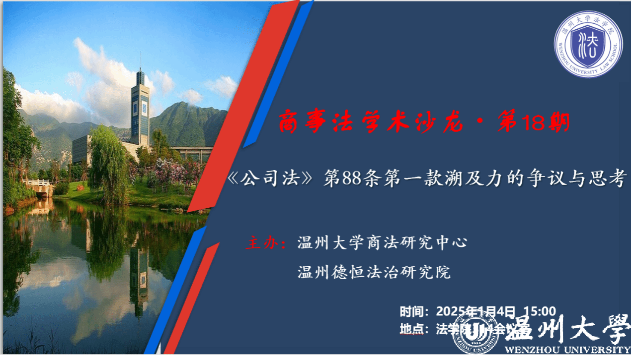 近日,“商事法学沙龙”第18期如期在yl永利集团官网登录314会议室举行,此次沙龙的主题是“《公司法》第88条第一款溯及力的争议与思考”。本次活动由永利集团官网商法研究中心和温州德恒法治研究院联合主办,yl永利集团官网登录李勇军教授主持,温州市中级人民法院、温州市鹿城区人民法院等法院法官和北京德恒(温州)律师事务所、浙江嘉瑞成律师事务所、浙江光正大律师事务所、浙江东瓯律师事务所律师及yl永利集团官网登录部分师生20余人参加研讨。