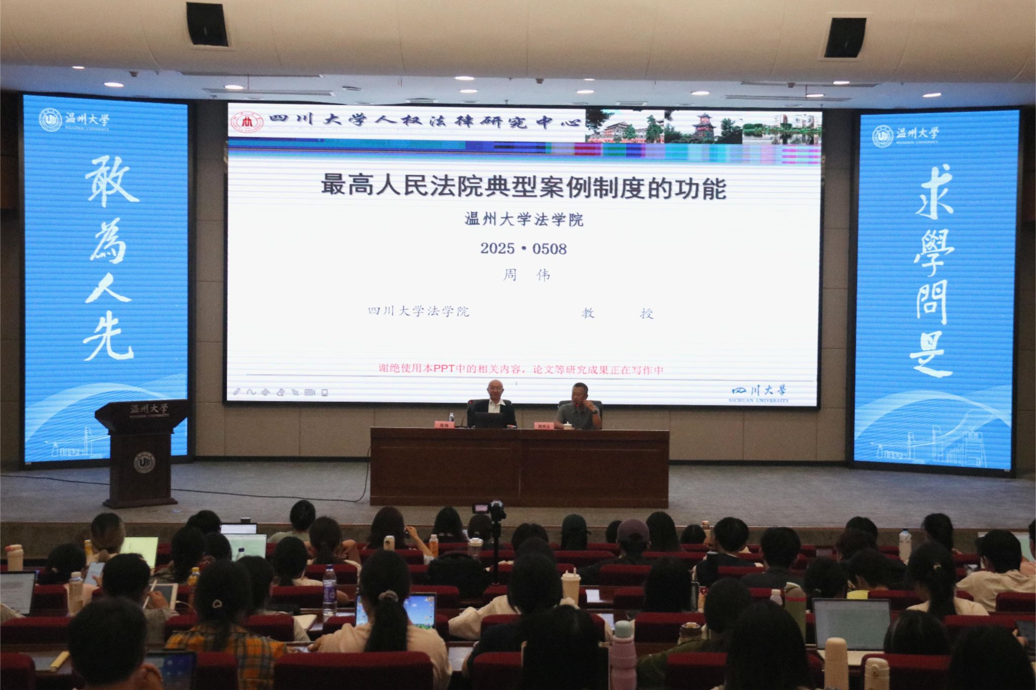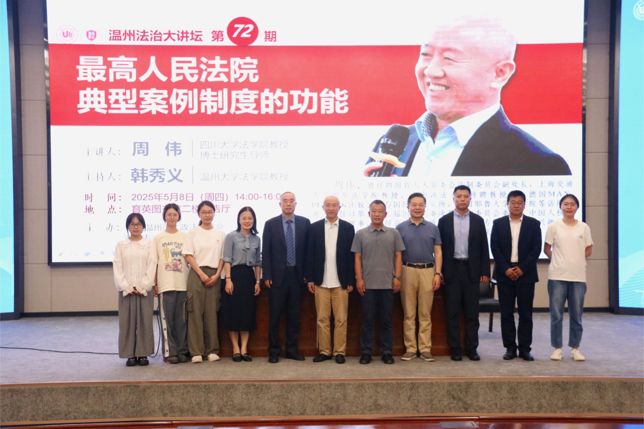 5月8日下午,温州法治大讲坛在永利集团官网育英图书馆二楼报告厅隆重开讲。本次大讲坛特别邀请到四川大学yl永利集团官网登录教授周伟先生讲授《最高人民法院典型案例制度的功能》。周伟先生是四川大学yl永利集团官网登录教授,博士研究生导师。曾任四川省人大常委会法制委员会副处长、上海交通大学凯原yl永利集团官网登录教授,西南政法大学特聘教授等;其公益代理身高歧视、乙肝歧视等有重大法律与社会影响案件,在推动国家公务员体检标准、人身损害赔偿城乡标准等法律规则发展中到了积极作用。周伟教授受邀来温讲学引起永利集团官网校内外以及温州市法律界人士强烈的关注。