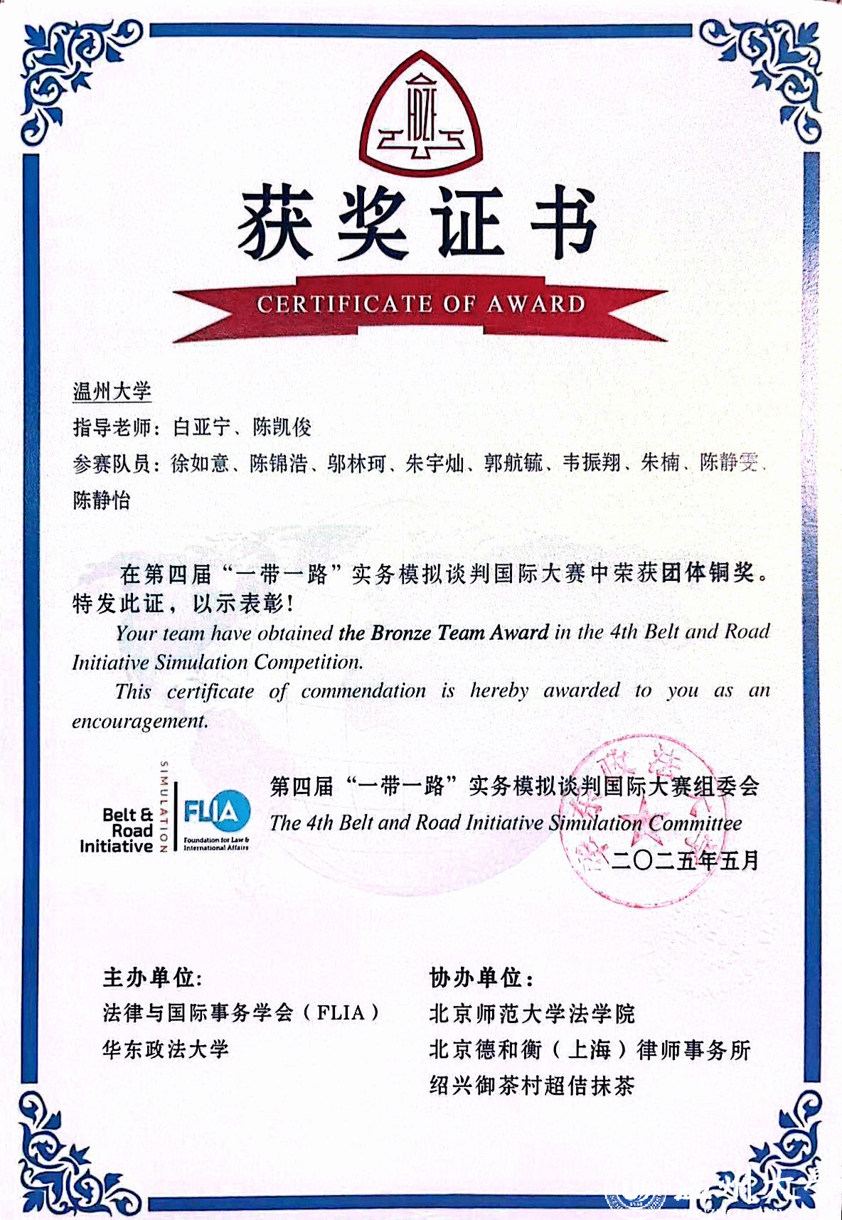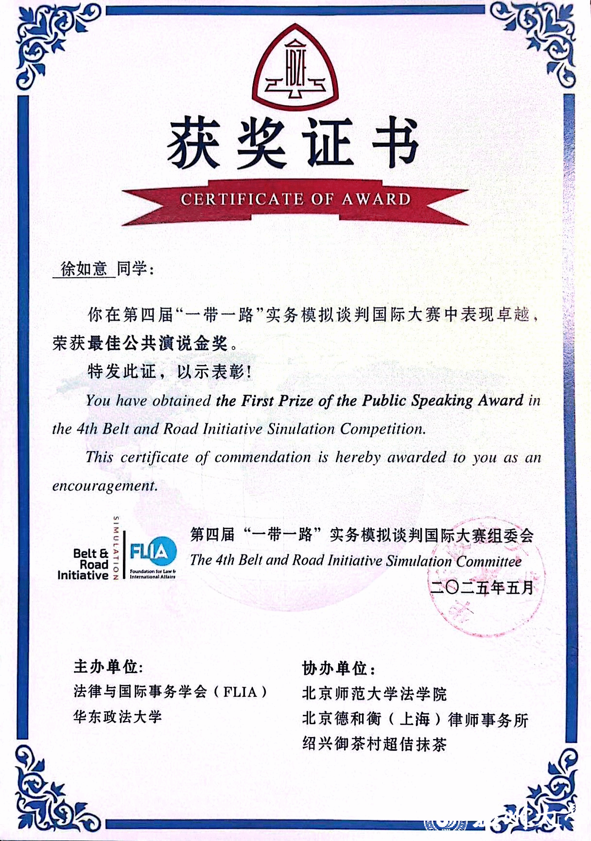 2025年5月10日至11日,第四届“一带一路实务模拟谈判国际大赛”在华东政法大学松江校区圆满落幕!来自全国68所高校的精英学子齐聚一堂,以智慧与激情展开巅峰对决。在这场国际化的赛事中,永利集团官网代表队凭借扎实的专业功底与默契的团队协作,勇夺团体铜奖! 23级国际经贸规则班郭航毓同学、23级法学2班徐如意同学分别获最佳法律辩论金奖、最佳公共演说金奖。