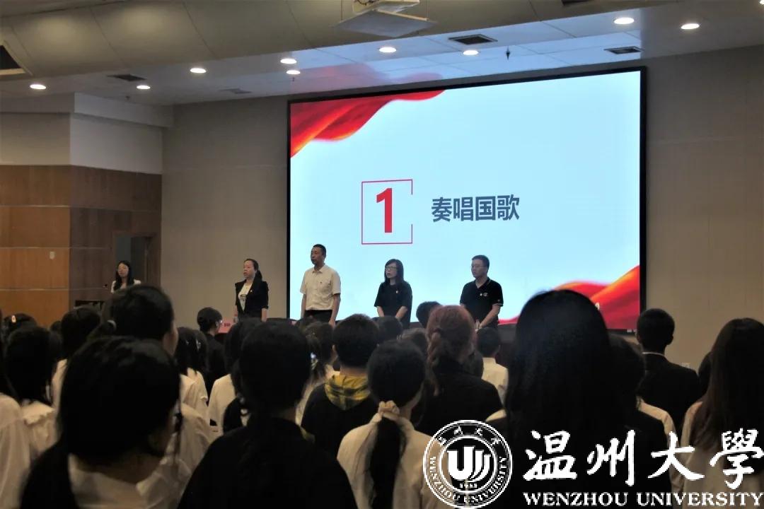 此次结业典礼共有五项议程。首先,全体起立,奏唱国歌。
