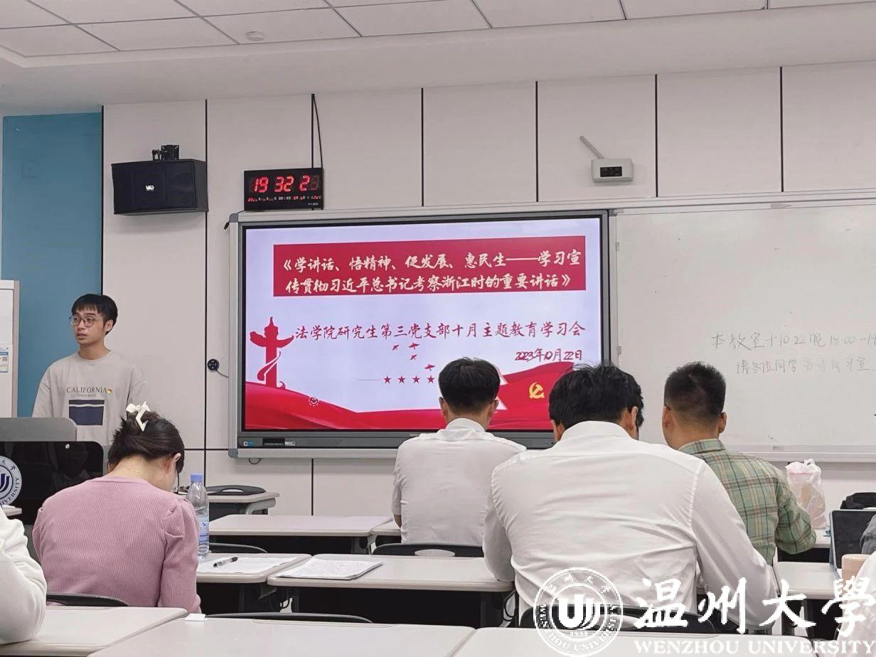 2023年10月22日晚,yl永利集团官网登录研究生第三党支部开展了“学讲话、悟精神、促发展、惠民生”主题党日活动,重点学习宣传贯彻习近平总书记考察浙江时的重要讲话。付玉霞、蒋元旦、项娉娉、周心钰、袁一函、葛康怡、张怡轩、王冠梅杰、莫友同志分别就“杭州亚运会开幕前夕,习近平赴浙江考察”“习近平总书记为浙江省改革发展作出的系列重要指示”“学好用好《习近平经济思想学习纲要》”三个主题进行了学习心得分享。