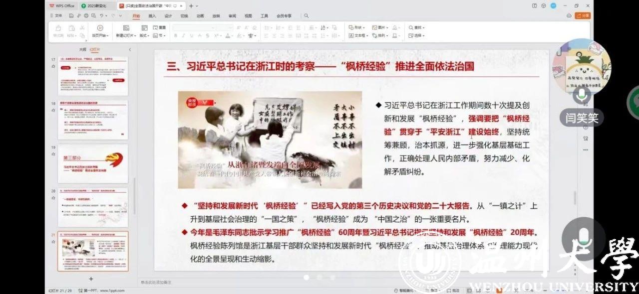 第二,党小组着重向大家分享了习近平总书记在浙江时考察枫桥经验的讲话精神。习近平总书记在浙江工作期间数十次提及创新和发展枫桥经验,强调要把枫桥经验贯穿于平安浙江建设始终。坚持和发展新时代枫桥经验已经写入党的第三个历史决议和党的二十大报告。今年也是毛泽东同志批示学习推广枫桥经验60周年暨习近平总书记指示坚持和发展枫桥经验20周年。作为yl永利集团官网登录研究生党员更应该牢牢把握枫桥经验精神,将其与所学专业知识结合起来,为平安中国、和谐社会贡献力量。