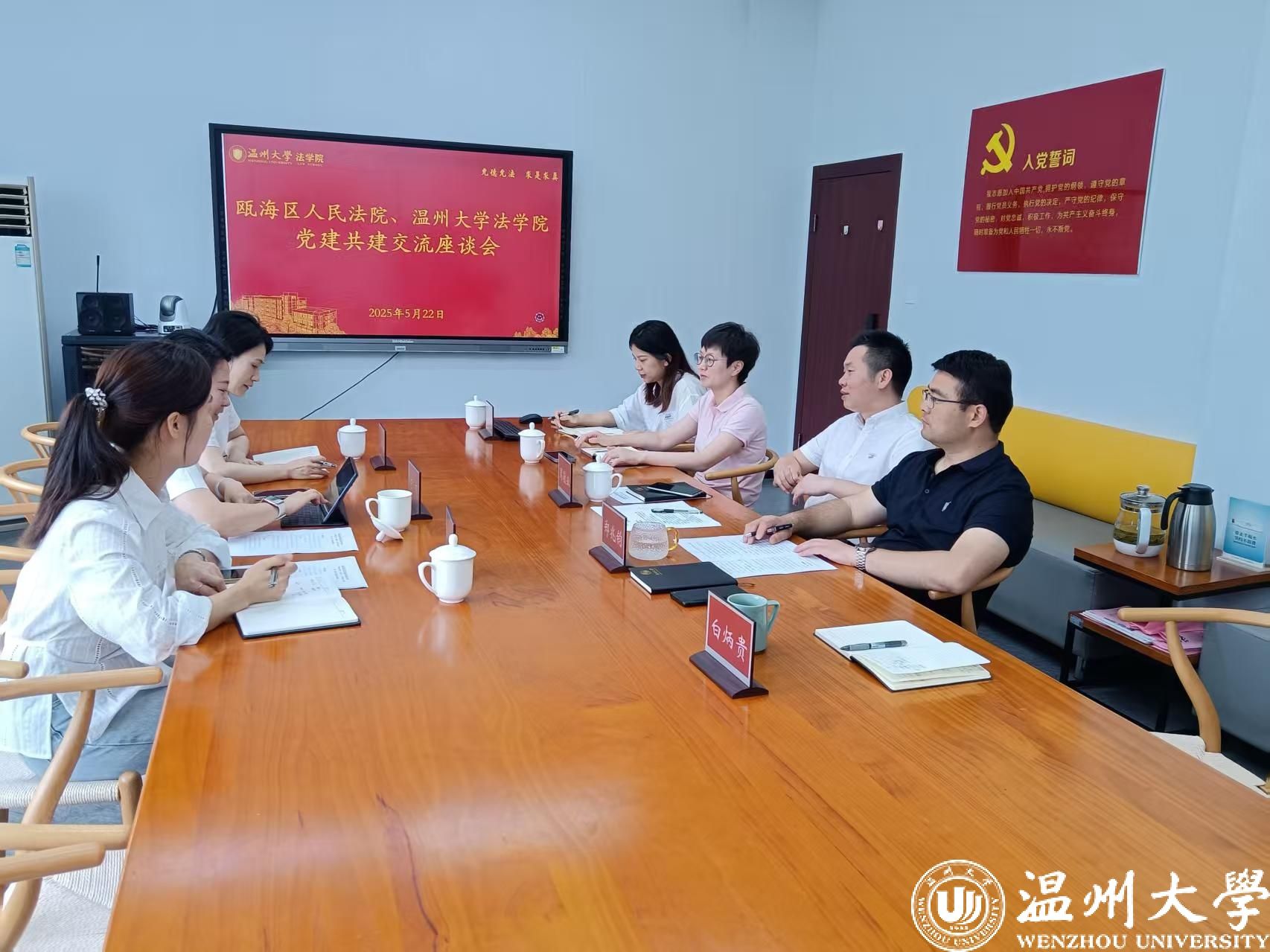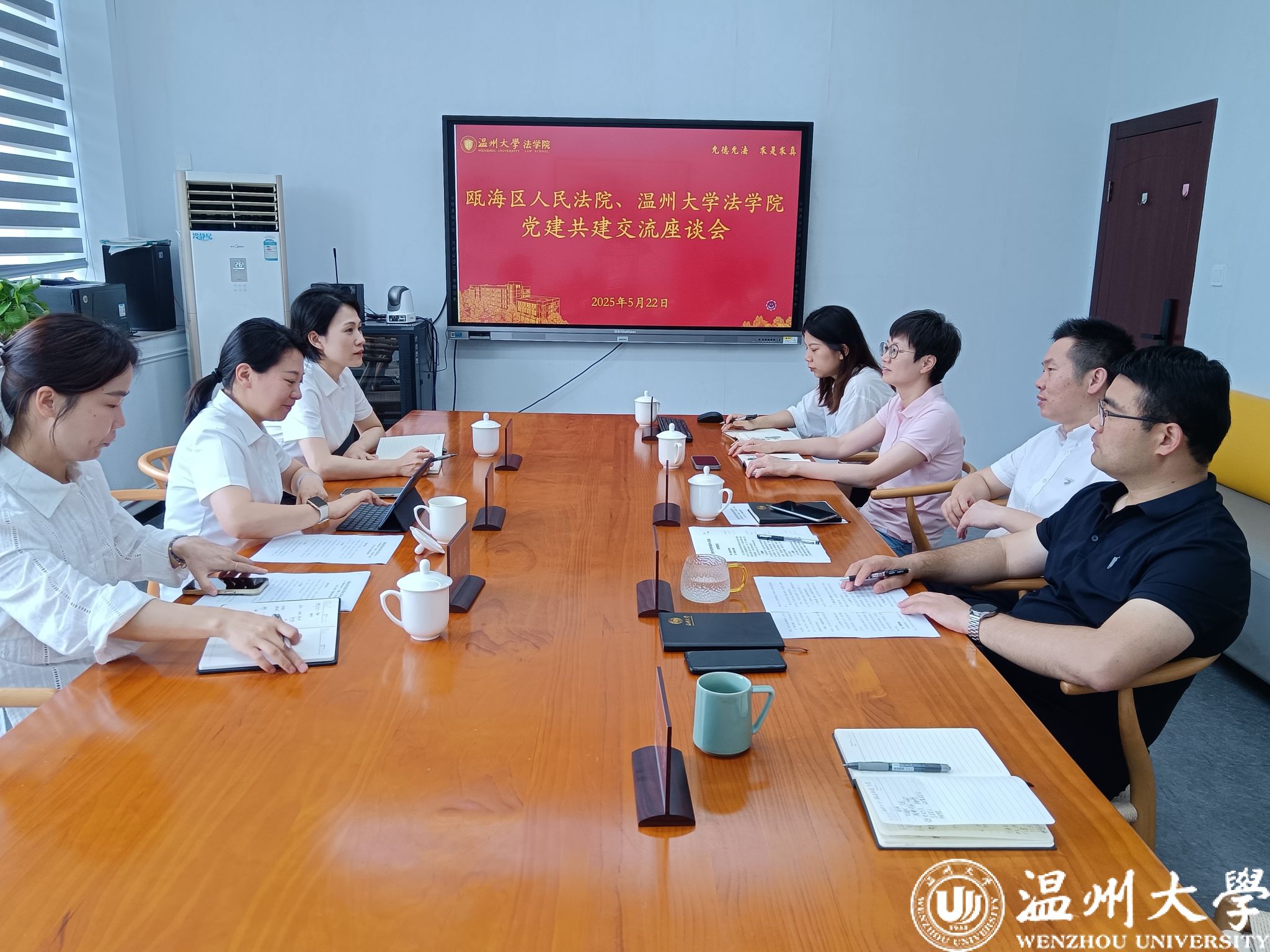 为深入学习贯彻党的二十届三中全会精神,深化党建引领作用,推动司法实践与法学教育深度融合,5月23日上午瓯海区人民法院政治部主任王克,仙岩人民法庭庭长王群英等一行来yl永利集团官网登录开展党建共建交流活动。公司党委书记周敬业、副经理周一颜、党委副书记郑兆钧等参加活动。