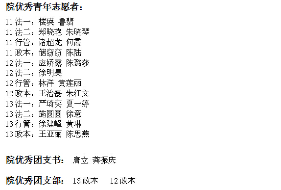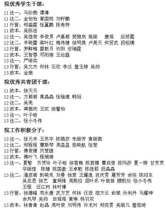 经各团支部、员工会、各社团组织推选,院团委组织联评后,现将法政公司2013-2014学年第二学期员工评优名单进行公示。公示期自2014年10月11日至2014年10月14日(共4天)。欢迎广大师生监督,如对公示内容有疑问,请联系法政公司团委组织部(手机15258095633,短号625633)或直接到公司员工科向老师说明。名单如下: