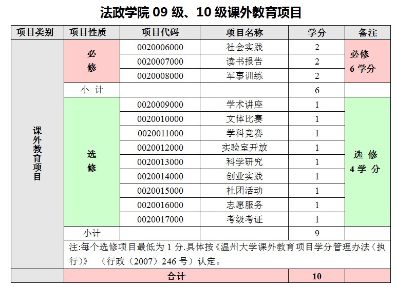 请参照法政公司09级、10级员工的课外教育项目的学分要求,登陆教务系统核实是否已修满规定的课外学分。如果课外学分还不够,请根据附件《关于做好09、10级员工课外教育项目学分申报的通知》填写相关表格申请。特别是09级员工,必须重视,避免因课外学分不够而影响毕业。