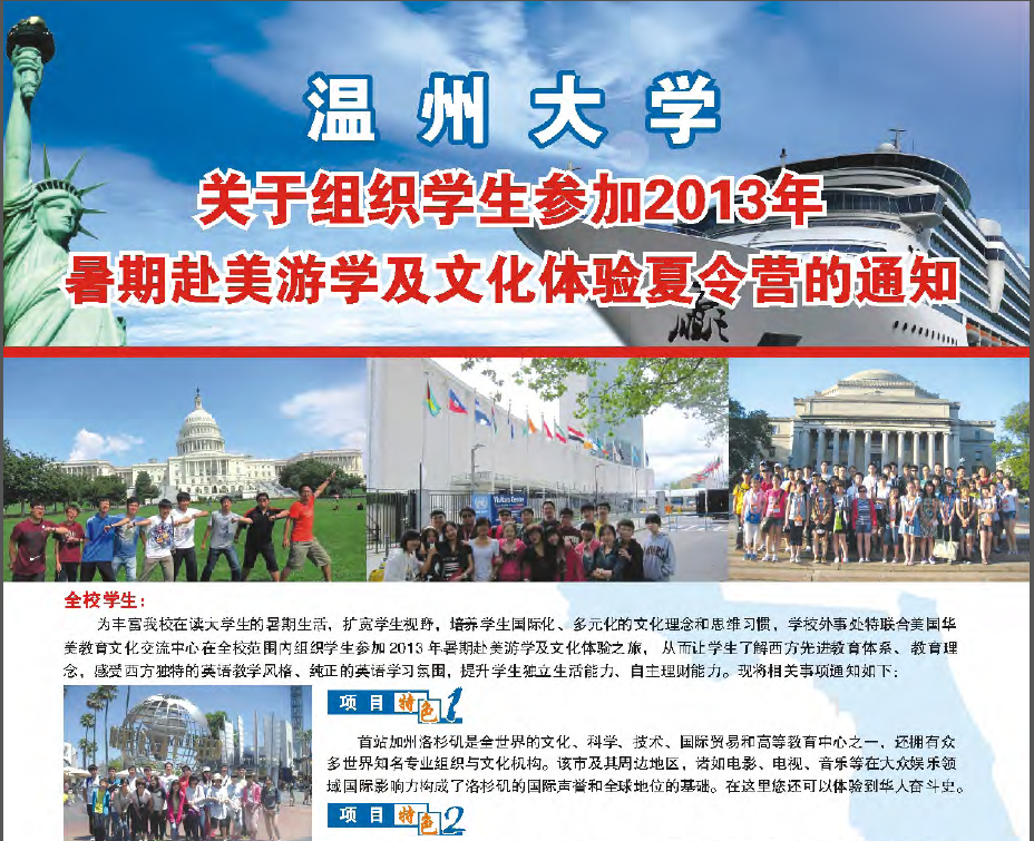 现有公司外事处和美国华美文化交流中心合办的"2013年永利集团官网员工暑期赴美游学及文化体验夏令营"项目,鼓励同学们踊跃参加此项交流活动。
