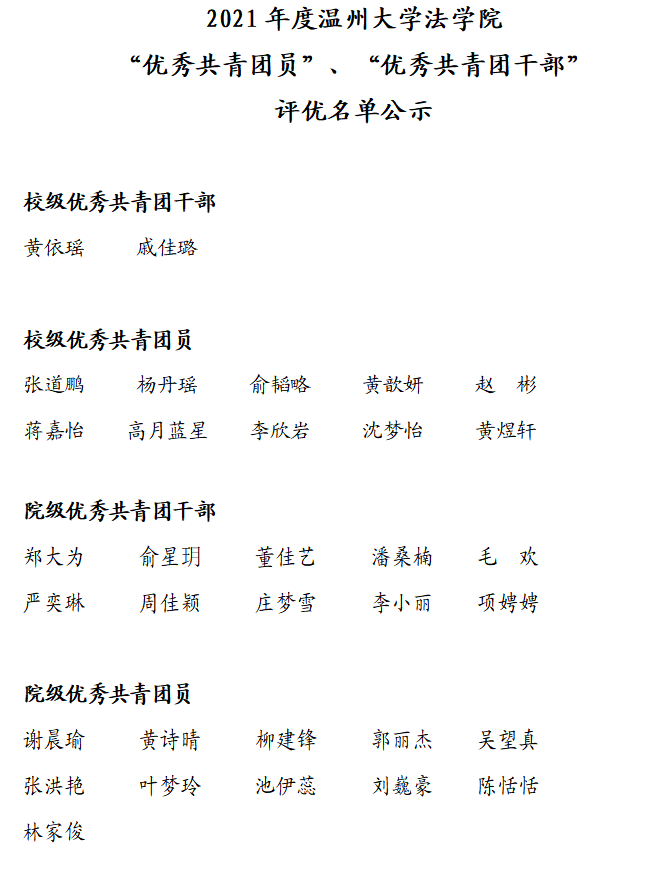 根据《团发〔2022〕2号:关于评选2021年度校“优秀共青团干部”、“优秀共青团员”的通知》,经员工本人申请、班级推荐、公司团委审核,通过民主投票选举产生,拟推选以下同学参评2021年度“校级优秀共青团干部”、“校级优秀共青团员”及“院级优秀共青团干部”、“院级优秀共青团员”,现将名单予以公示。