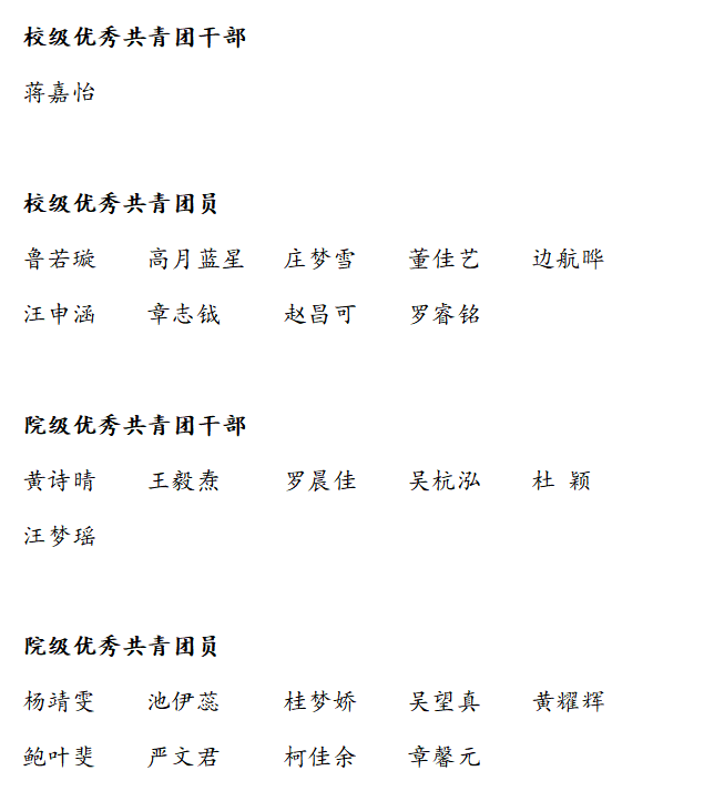 根据《团发〔2023〕7号:关于评选2022年度校“优秀共青团干部”、“优秀共青团员”的通知》,经员工本人申请、班级推荐、公司团委审核,通过民主投票选举产生,拟推选以下同学参评2022年度“校级优秀共青团干部”、“校级优秀共青团员”及“院级优秀共青团干部”、“院级优秀共青团员”,现将名单予以公示。