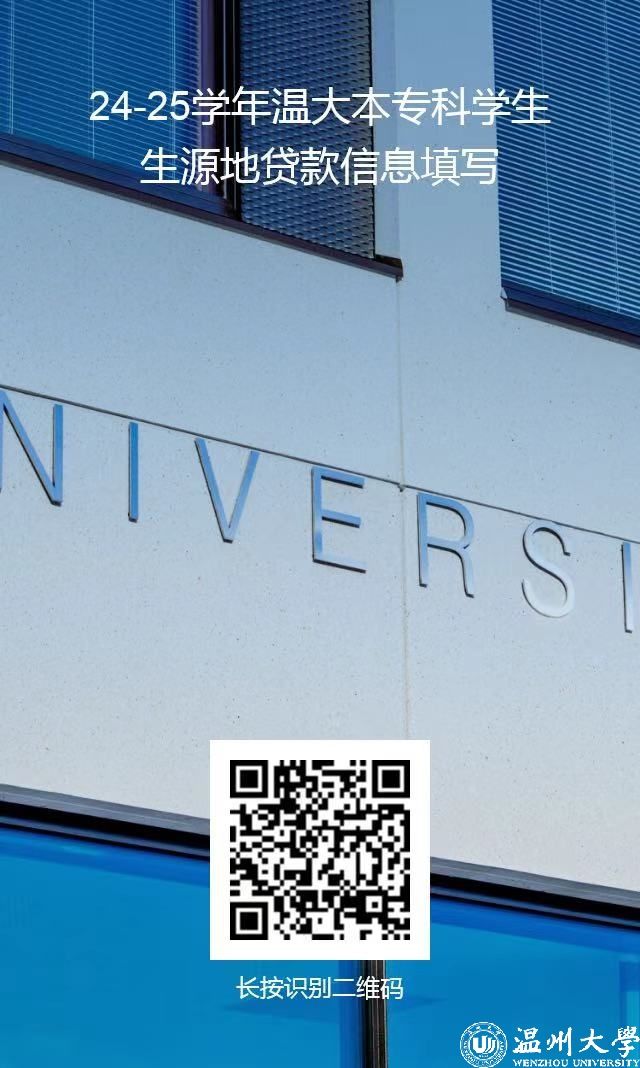根据国家开发银行生源地信用助学贷款手续办理的要求,员工在生源地办理完信用助学贷款后,需要高校在限定时间内进行网上回执录入,请办理国开行生源地贷款的新老生,务必在9月20日前在网上完成《24-25学年温大本专科员工生源地贷款信息填写》,二维码如下: